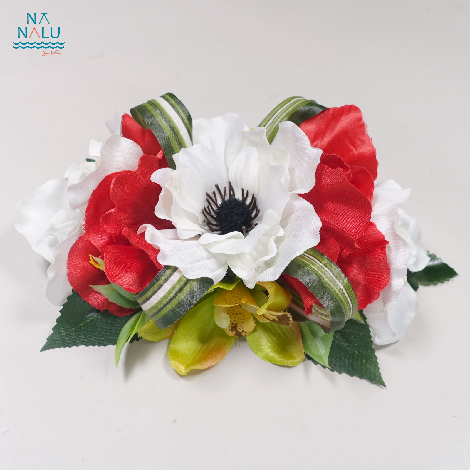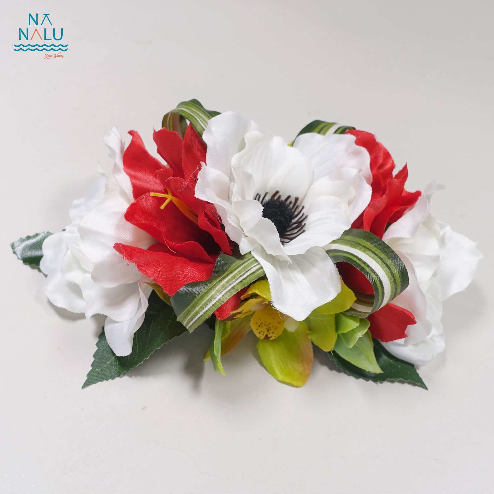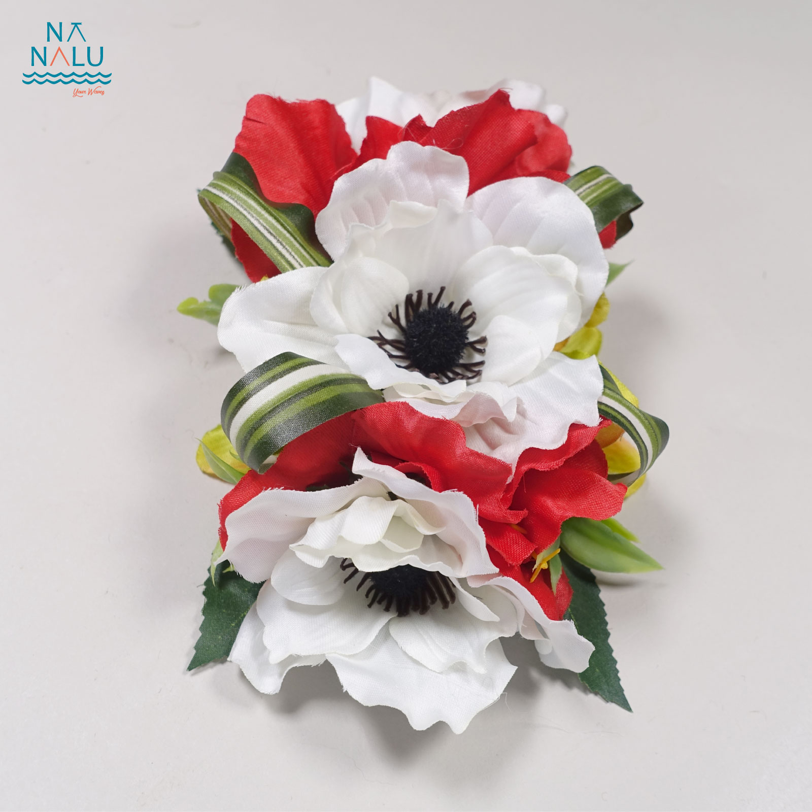 2色のアネモネを交互に配置して楽しさと華やかさを演出するかわいらしいクリップです。ブルー系とはまた違ったかわいい雰囲気のヘアクリップ(髪飾り)です。
