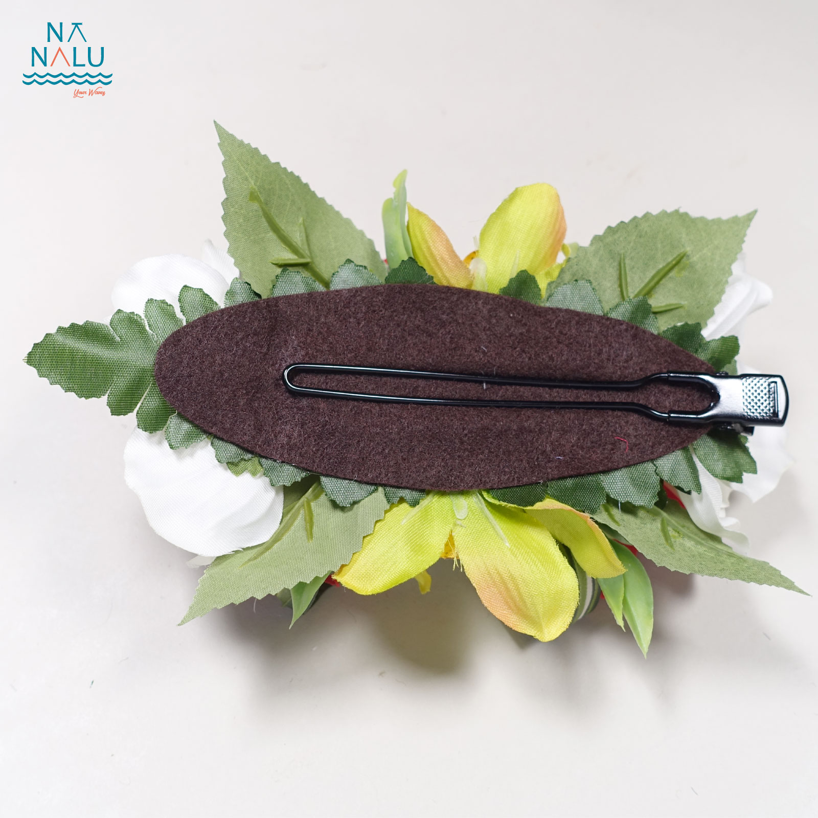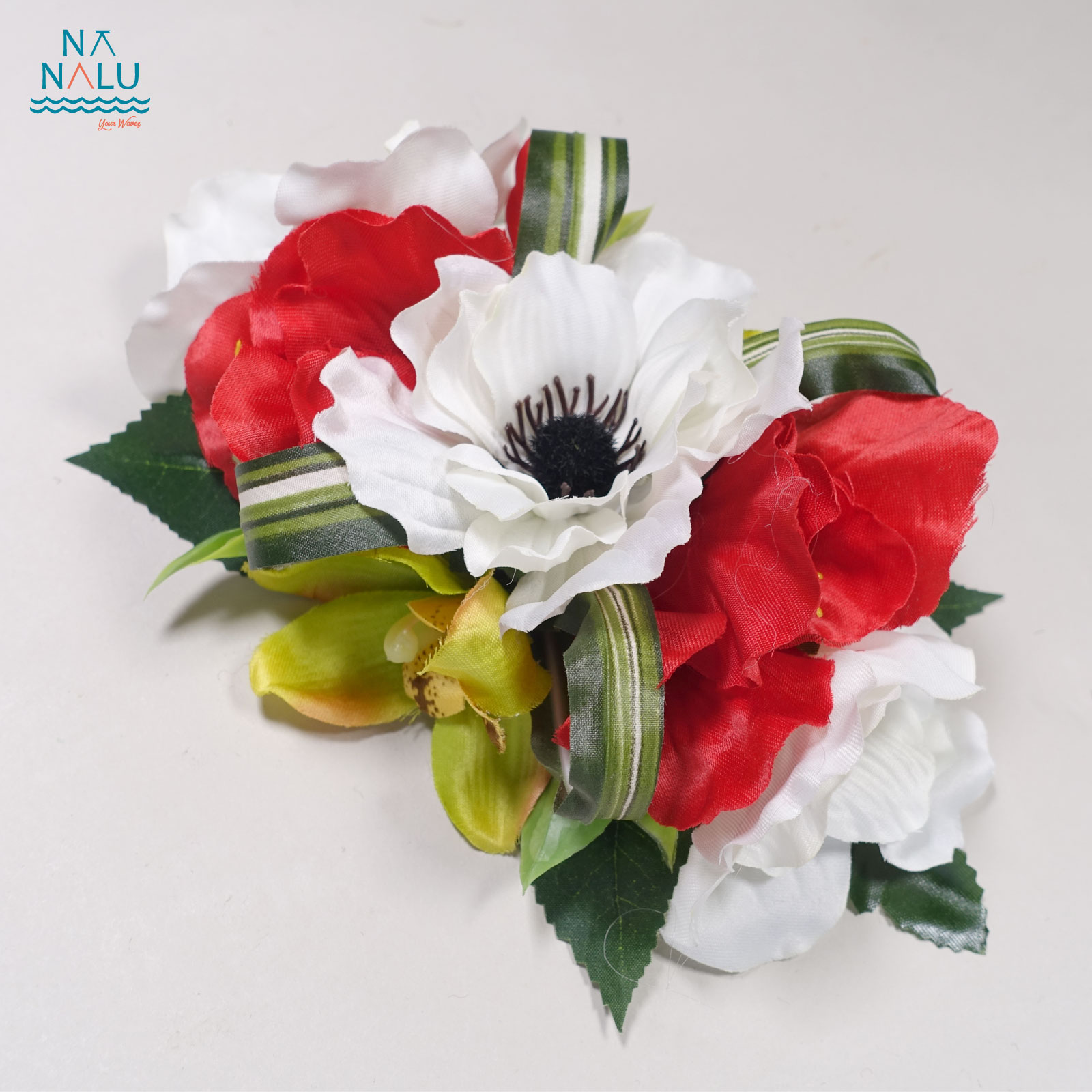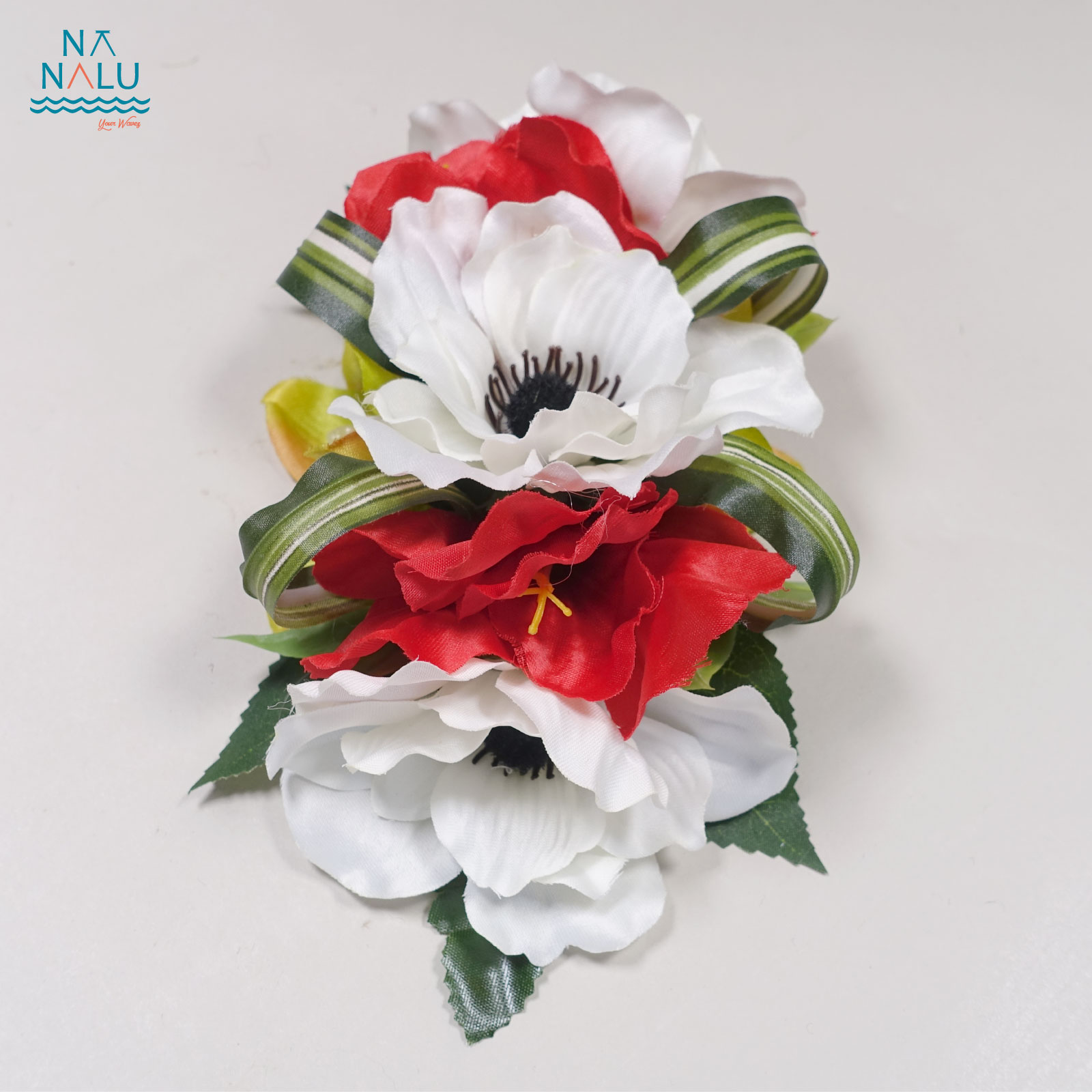 2色のアネモネを交互に配置して楽しさと華やかさを演出するかわいらしいクリップです。ブルー系とはまた違ったかわいい雰囲気のヘアクリップ(髪飾り)です。