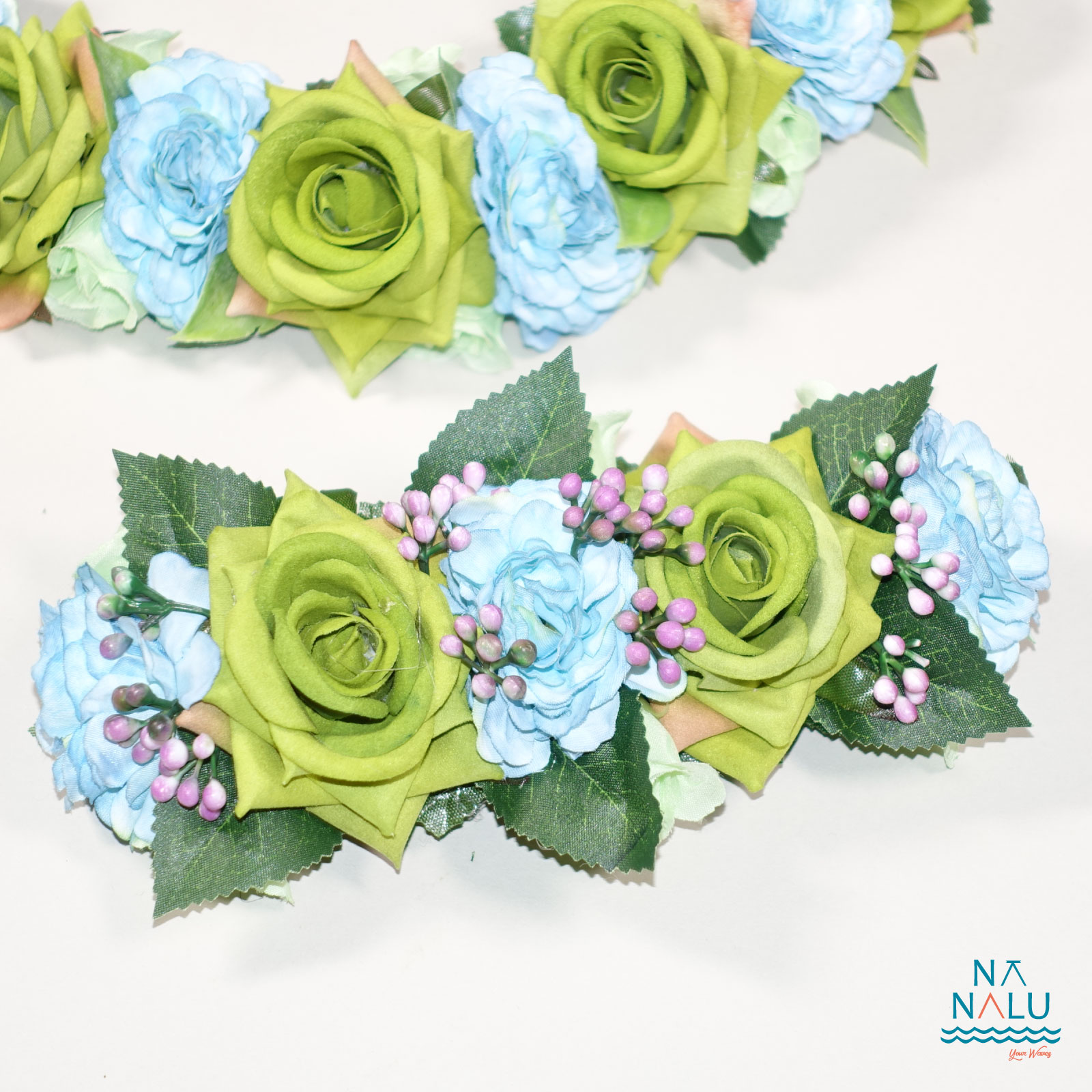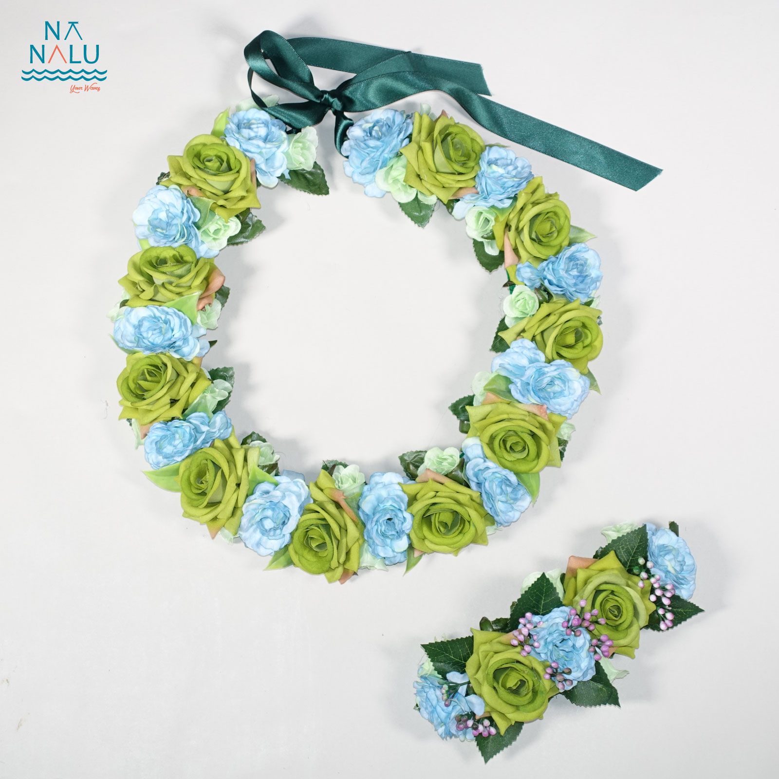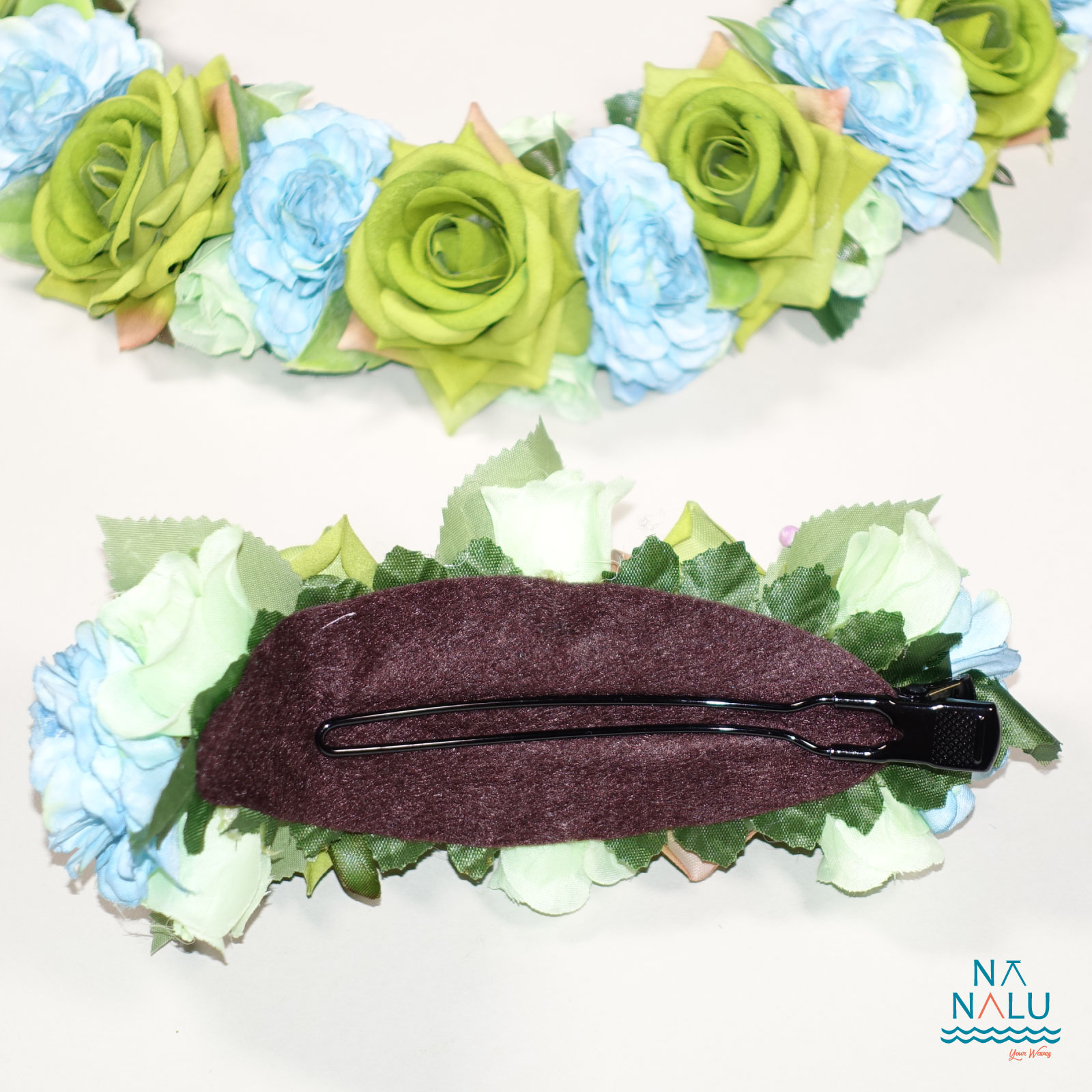 大人気の美しいローズを全周に使用したレイとヘアクリップのセットです。