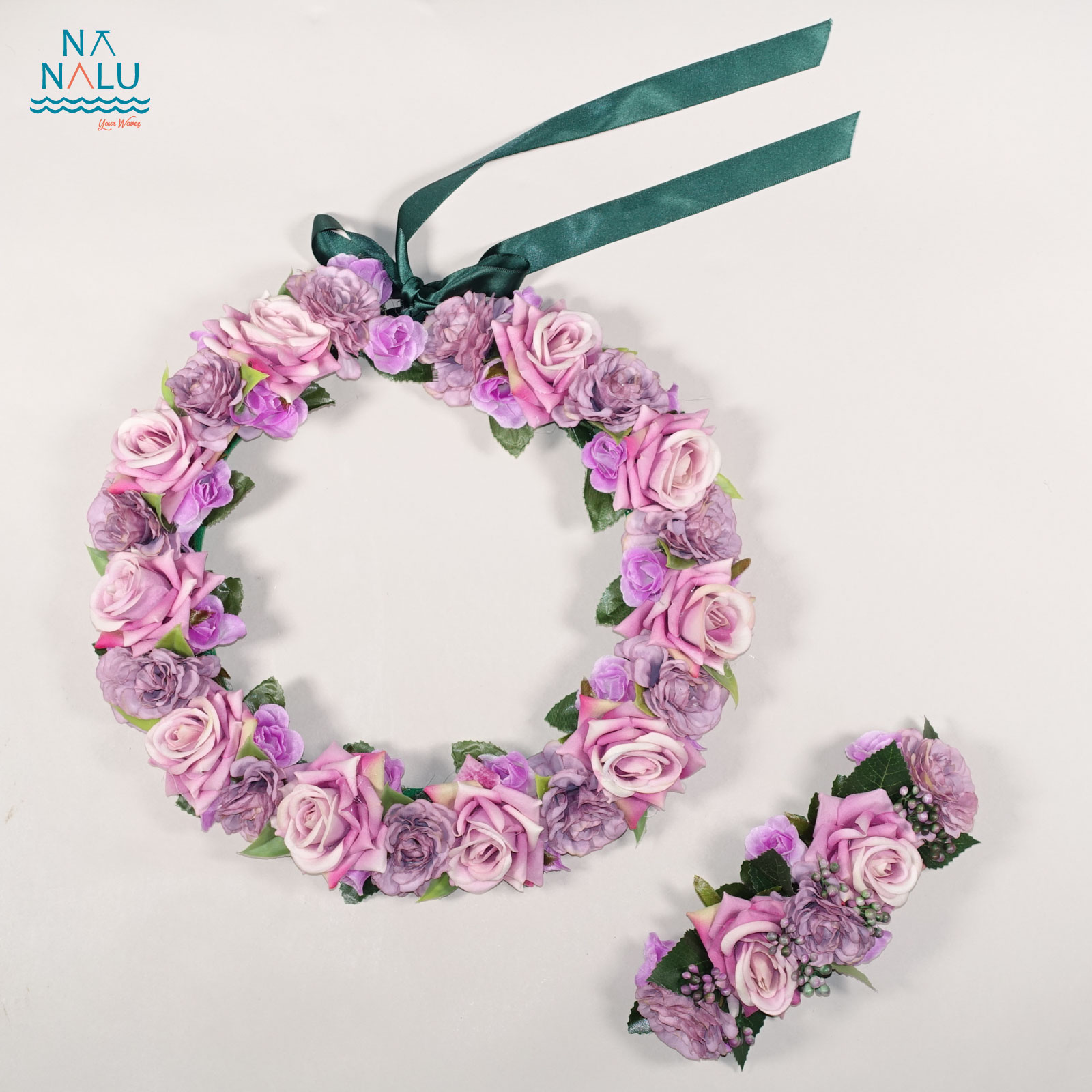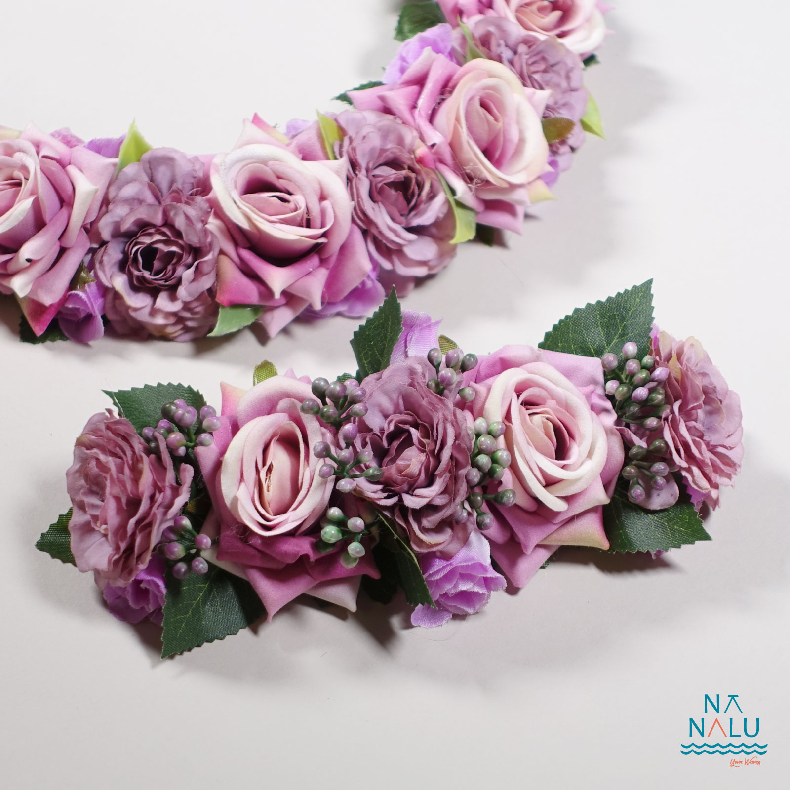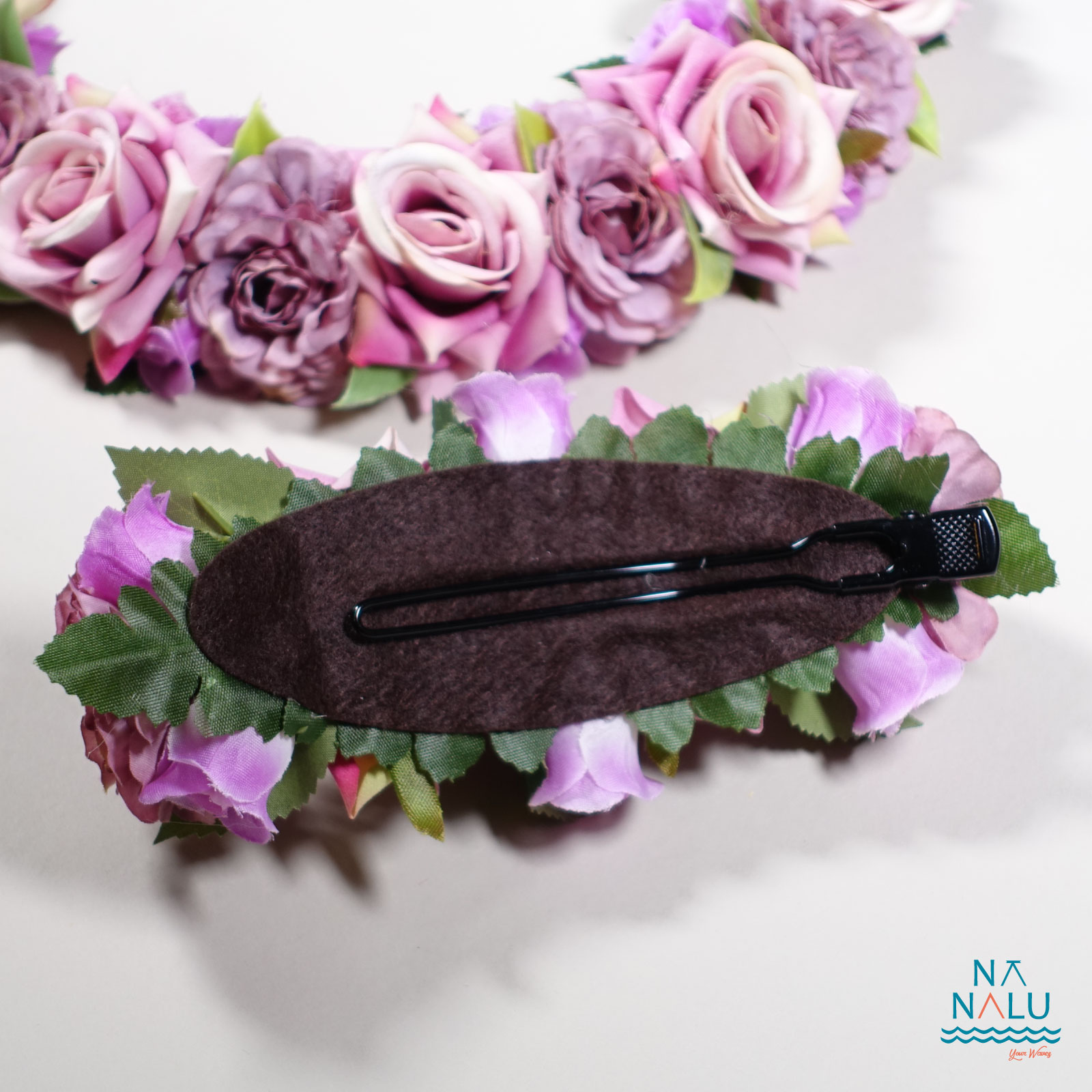 大人気の美しいローズを全周に使用したレイとヘアクリップのセットです。