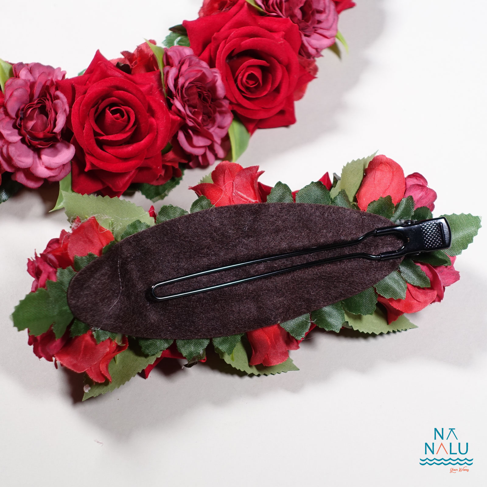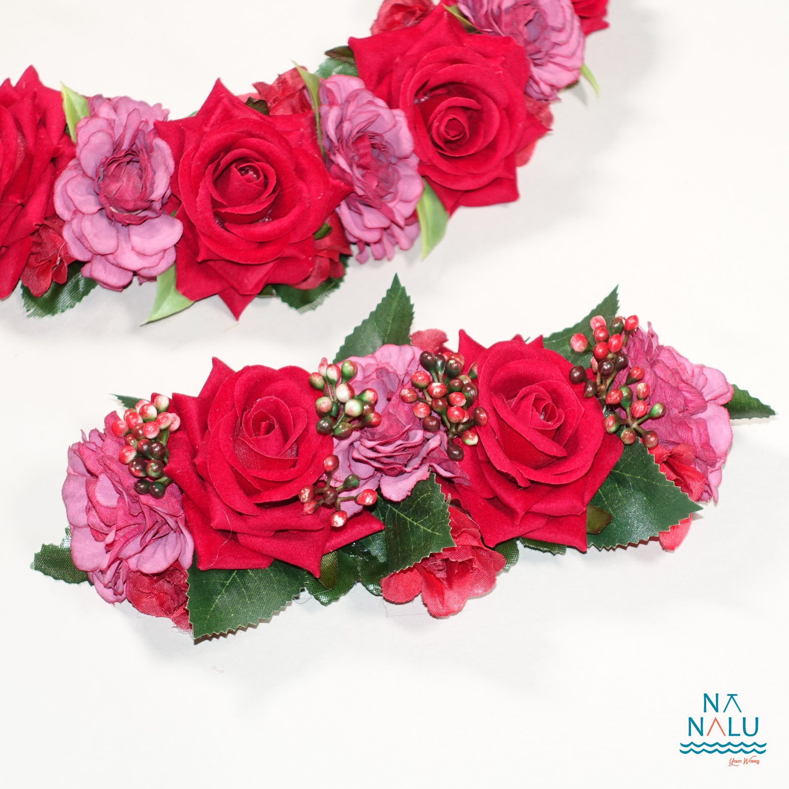 大人気の美しいローズを全周に使用したレイとヘアクリップのセットです。