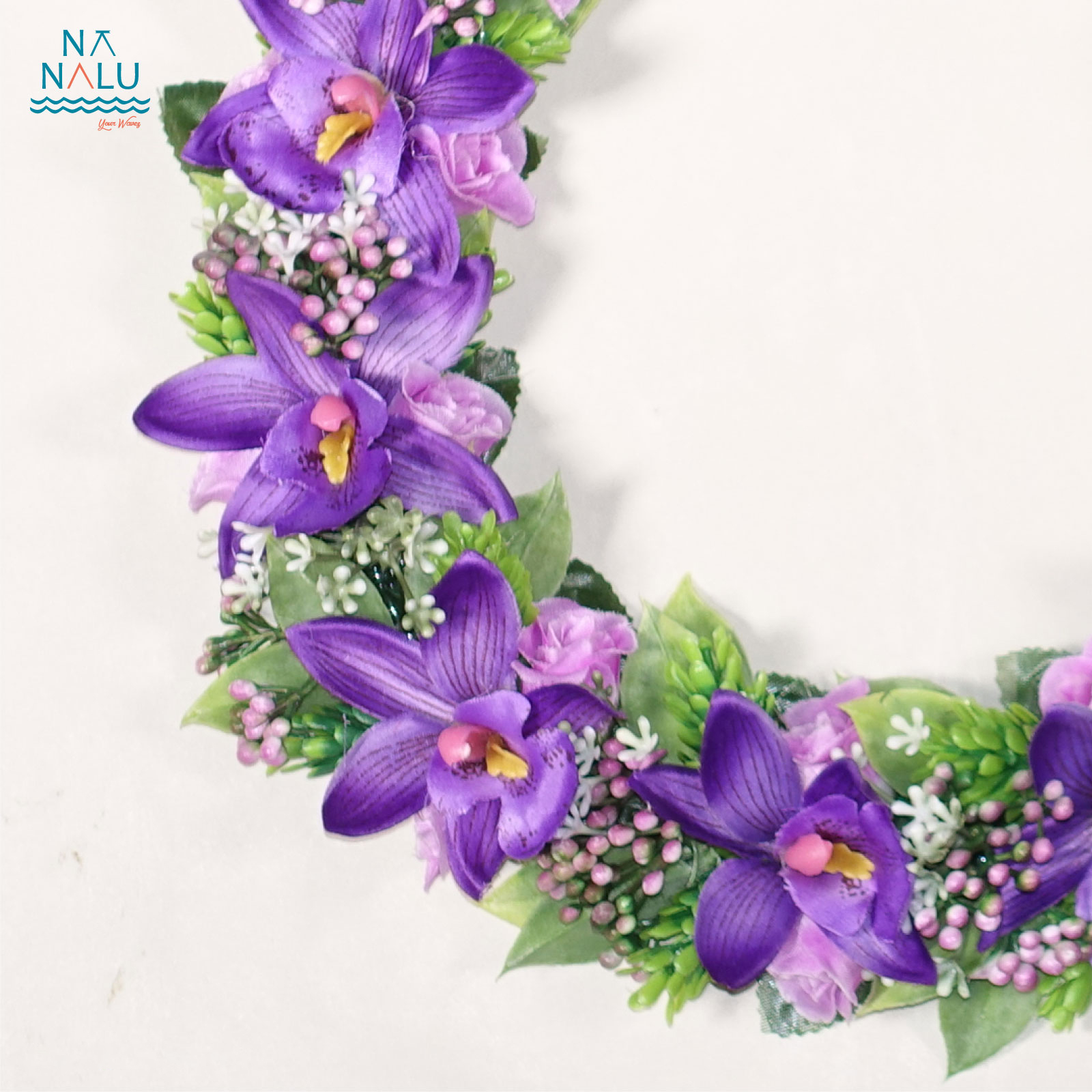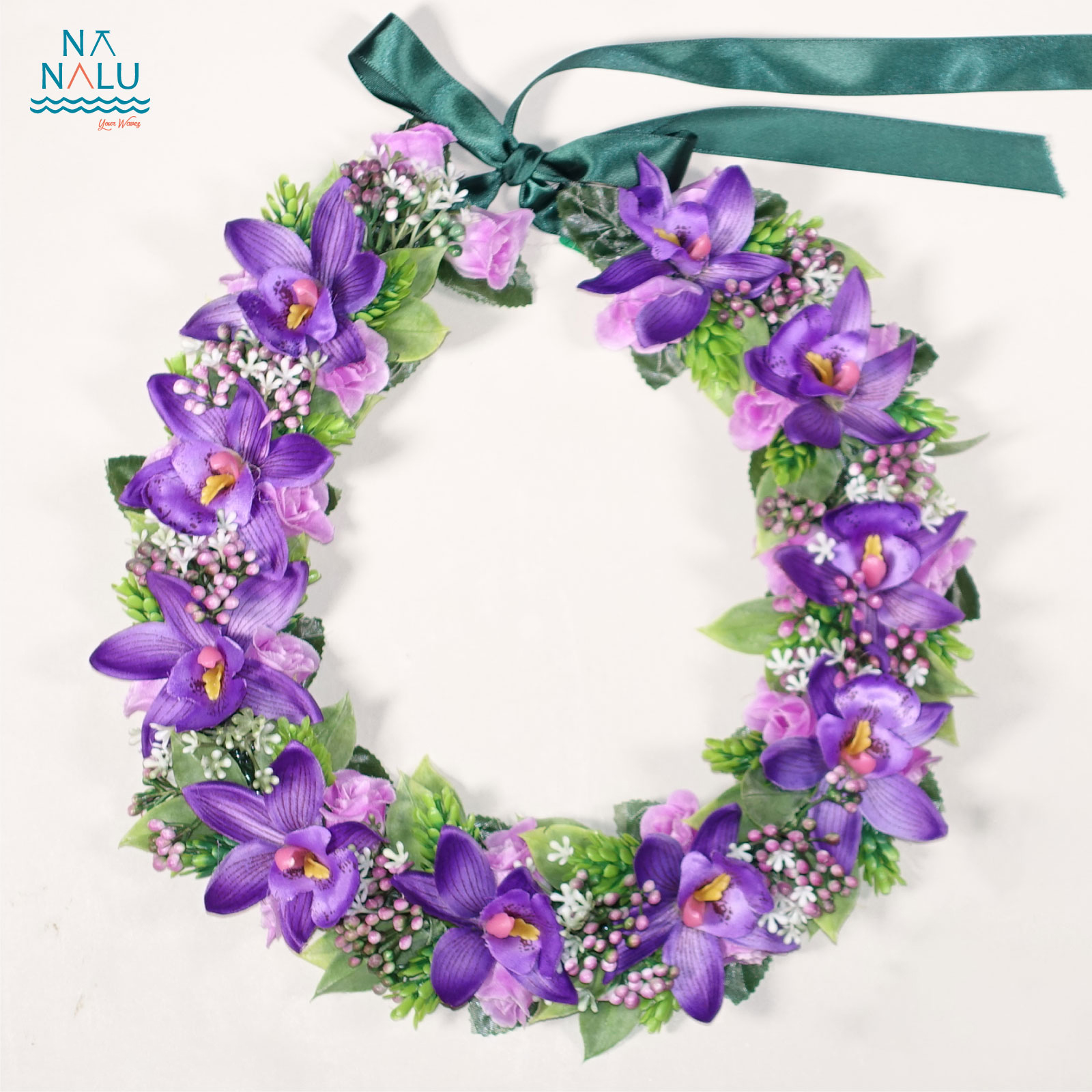 シンビジューム(欄)と小花、リーフをあしらった美しいレイとクリップです。