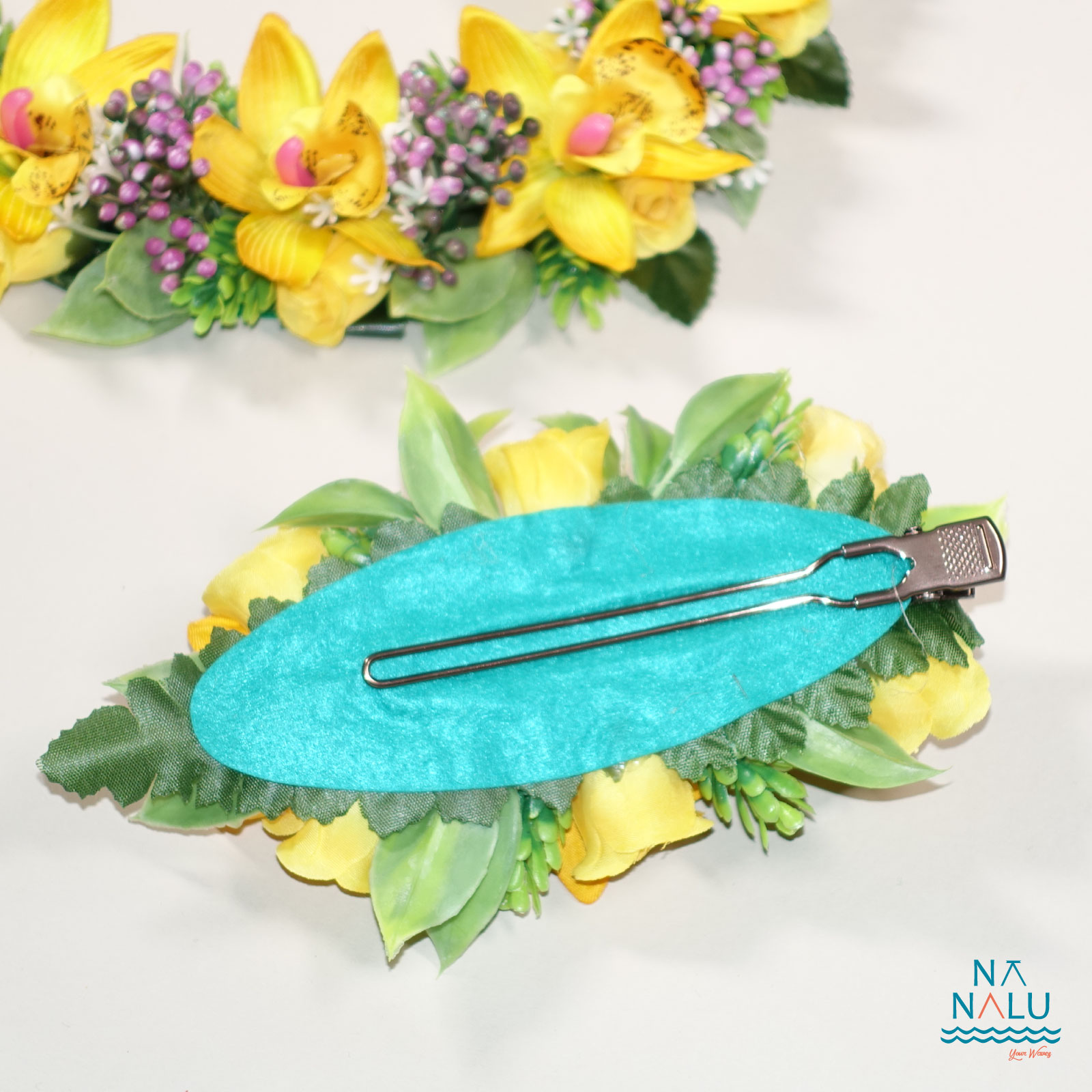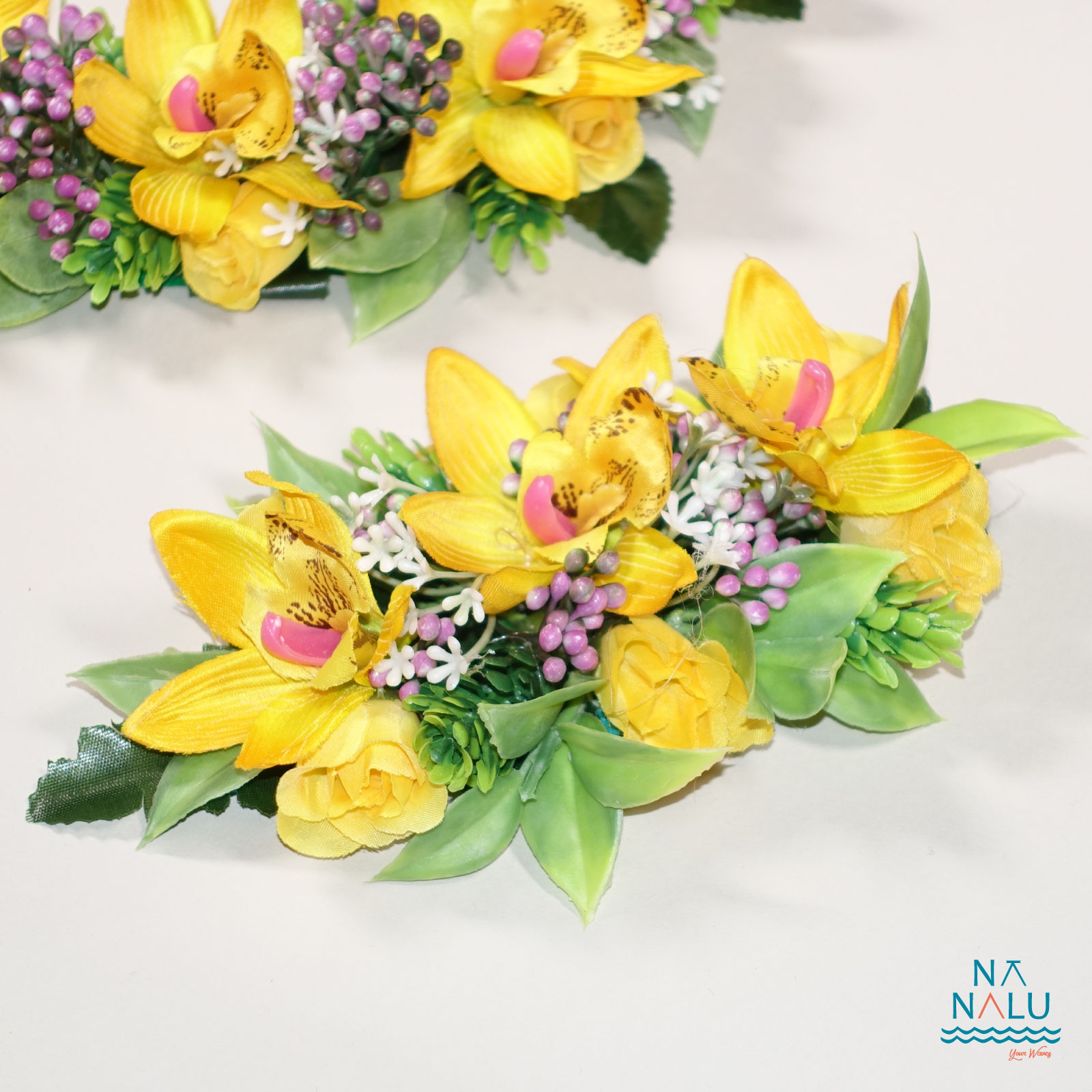 シンビジューム(欄)と小花、リーフをあしらった美しいレイとクリップです。