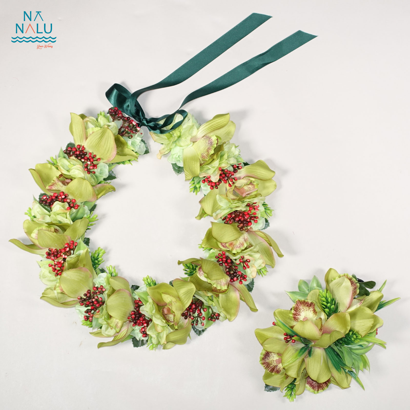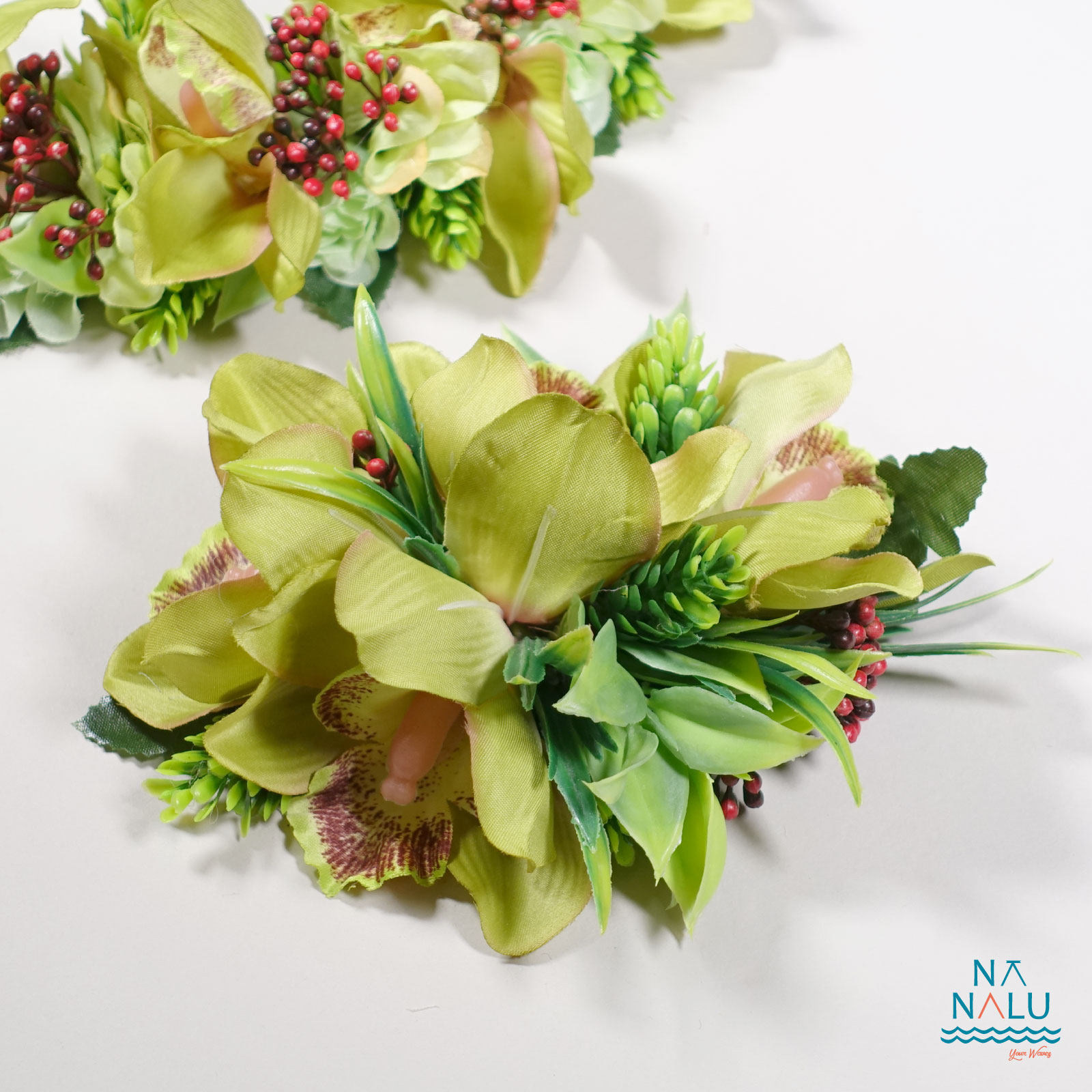 大きめのシンビジューム(欄)と小花、リーフをあしらった美しいレイとクリップです。