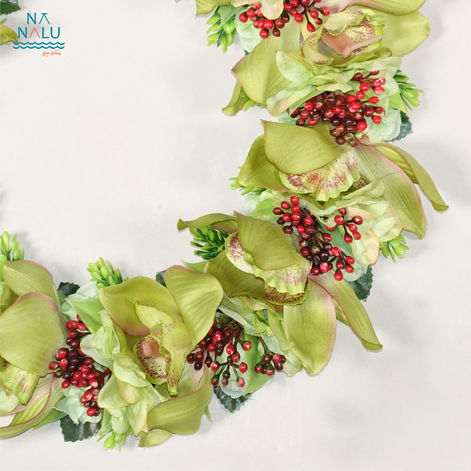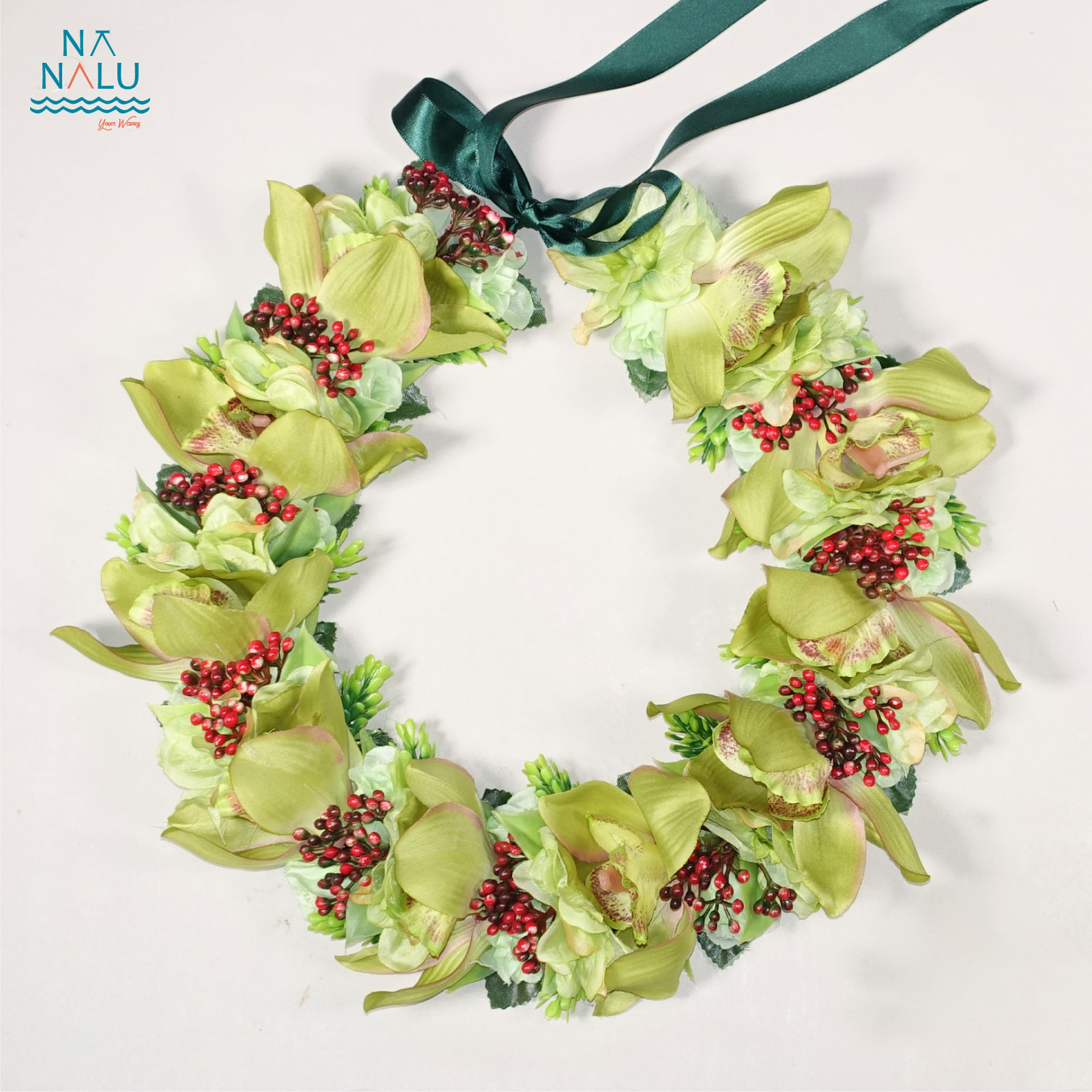 大きめのシンビジューム(欄)と小花、リーフをあしらった美しいレイです。