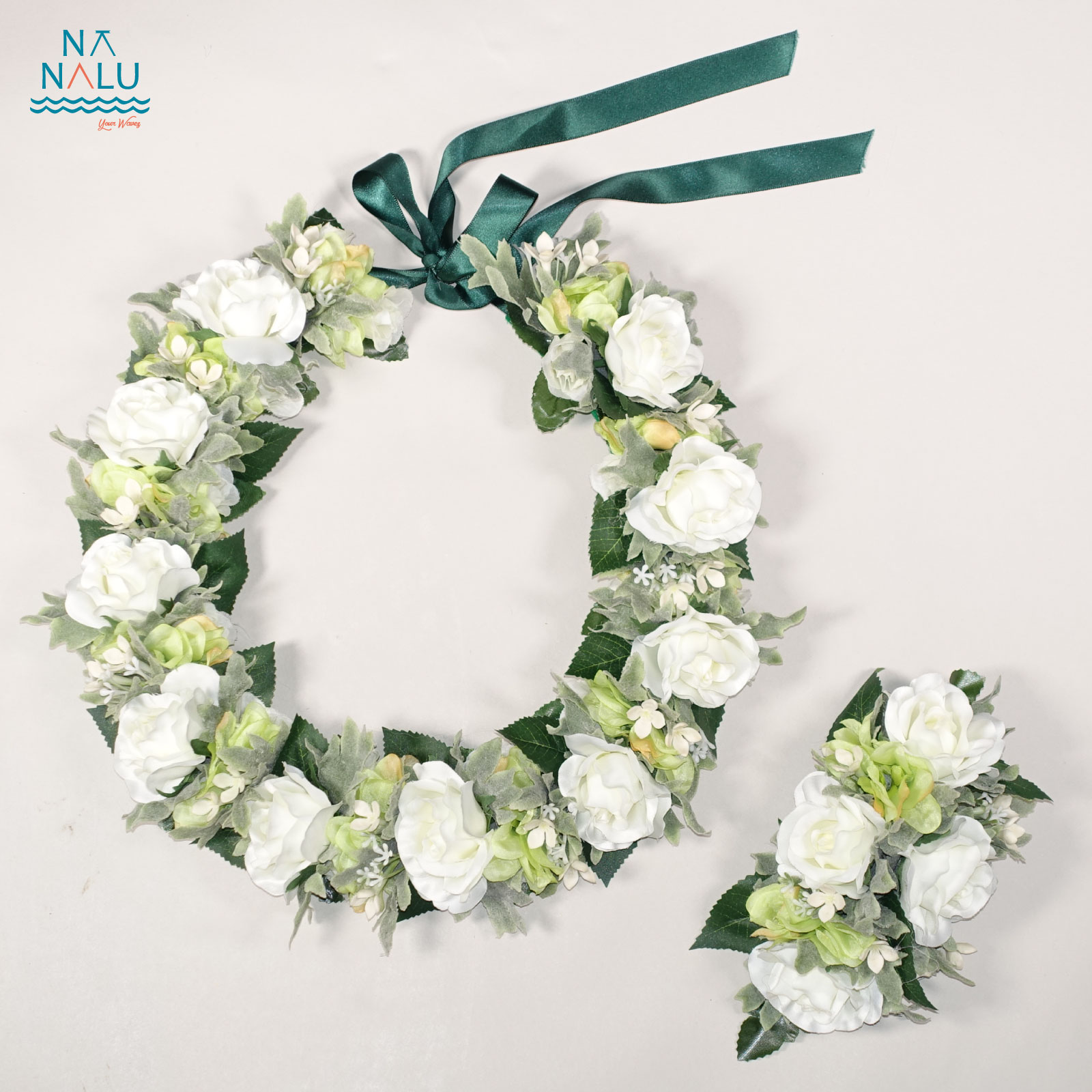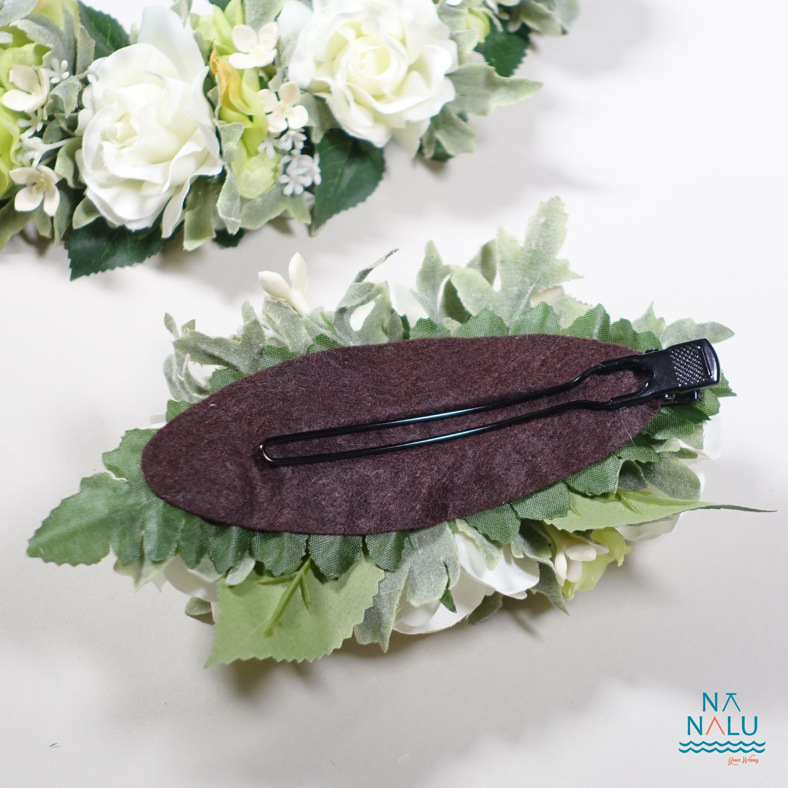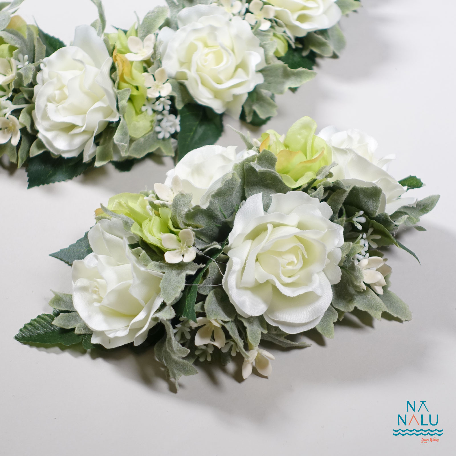 白いバラとナチュラルカーのシンビジューム、白系の小花やヒナヒナなどを組み合わせた清楚なイメージのレイ&クリップです。