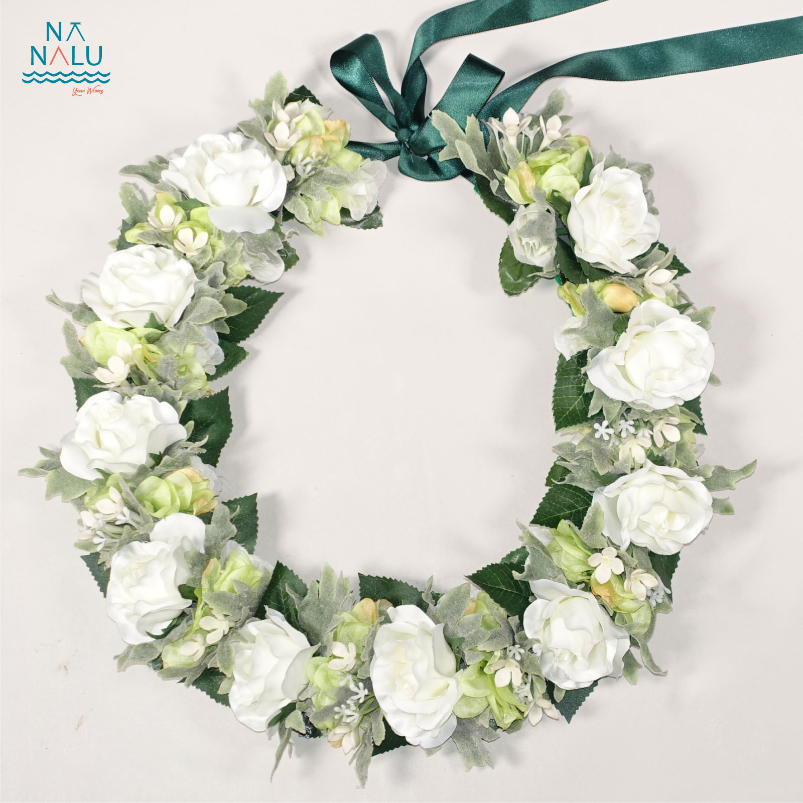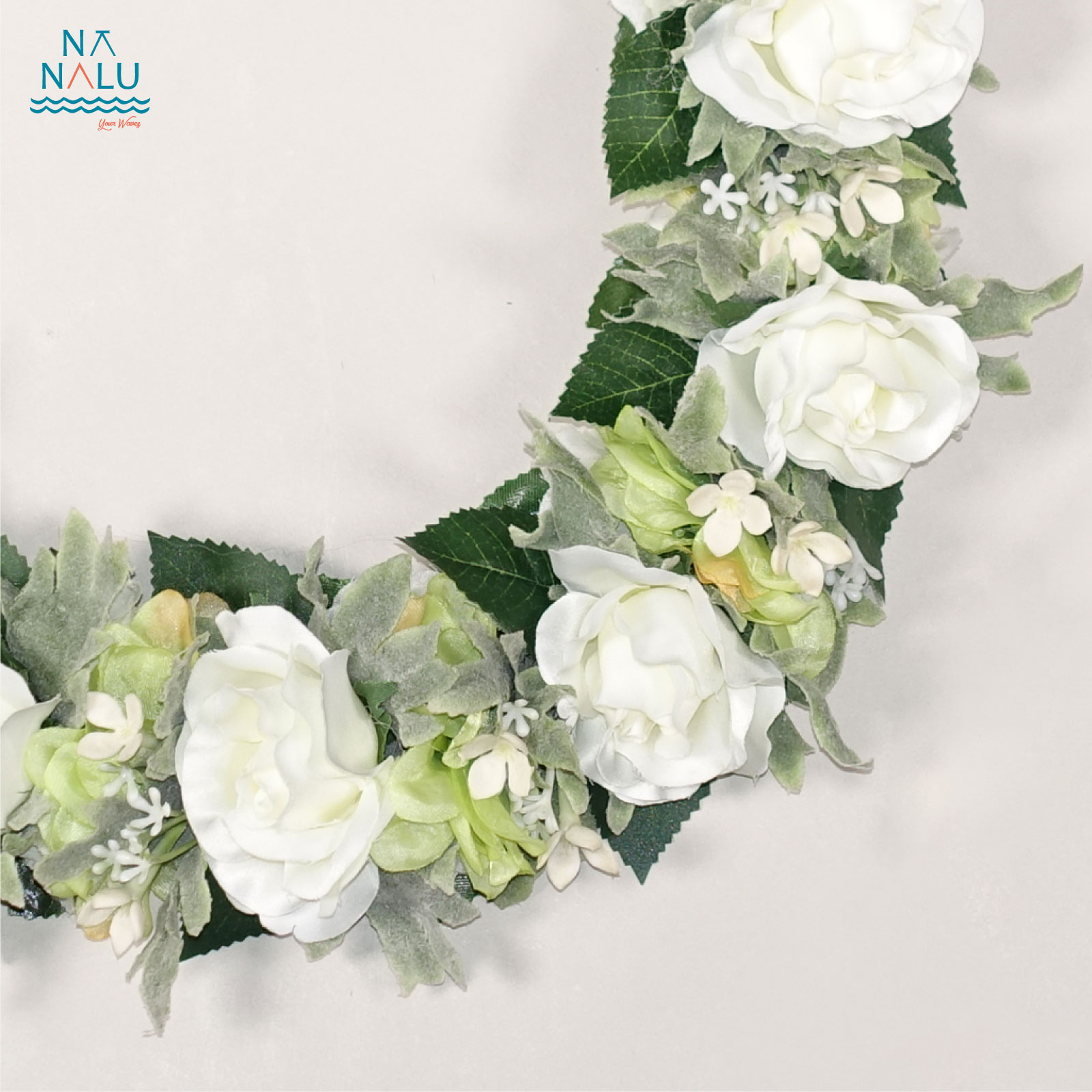 白いバラとナチュラルカーのシンビジューム、白系の小花やヒナヒナなどを組み合わせた清楚なイメージのレイ&クリップです。