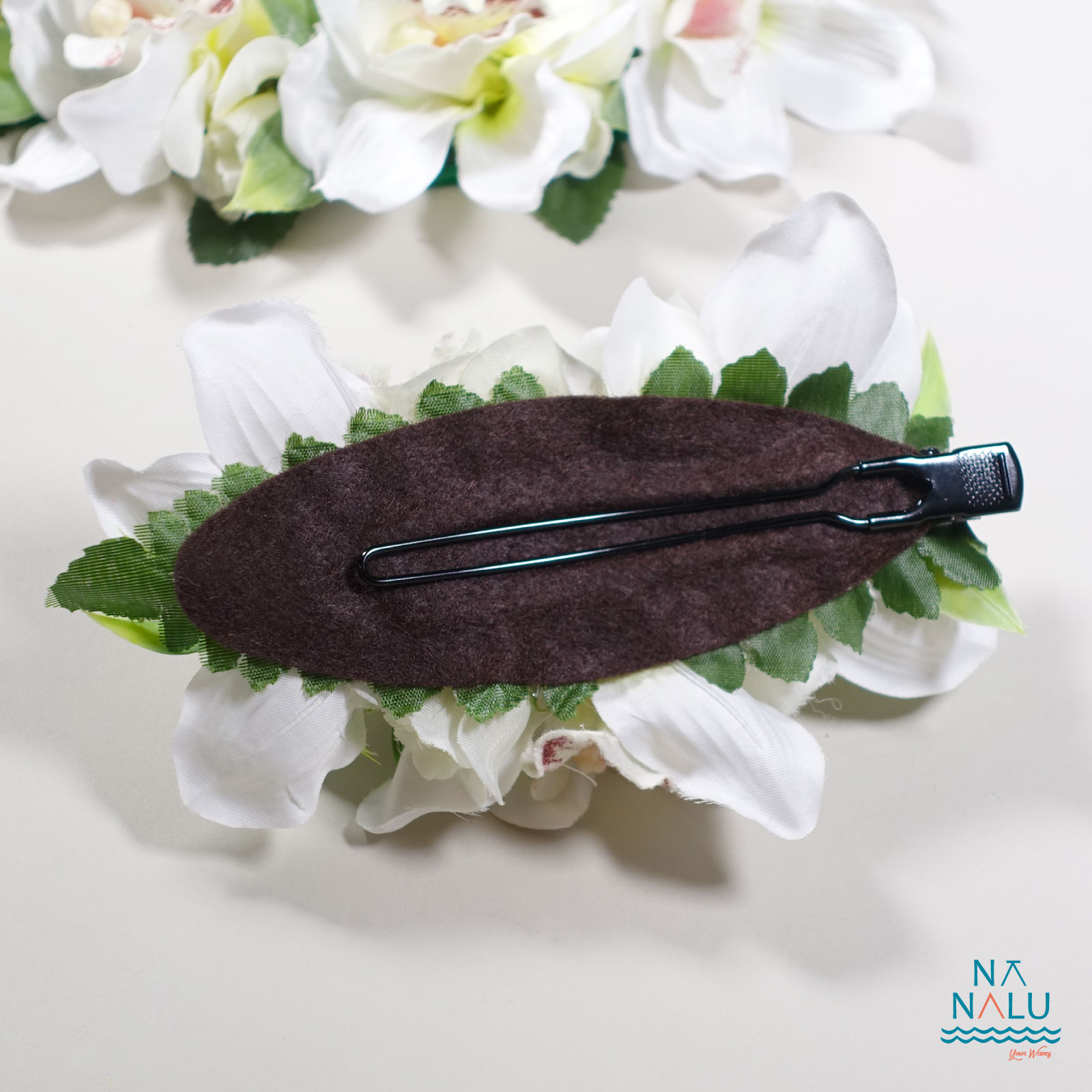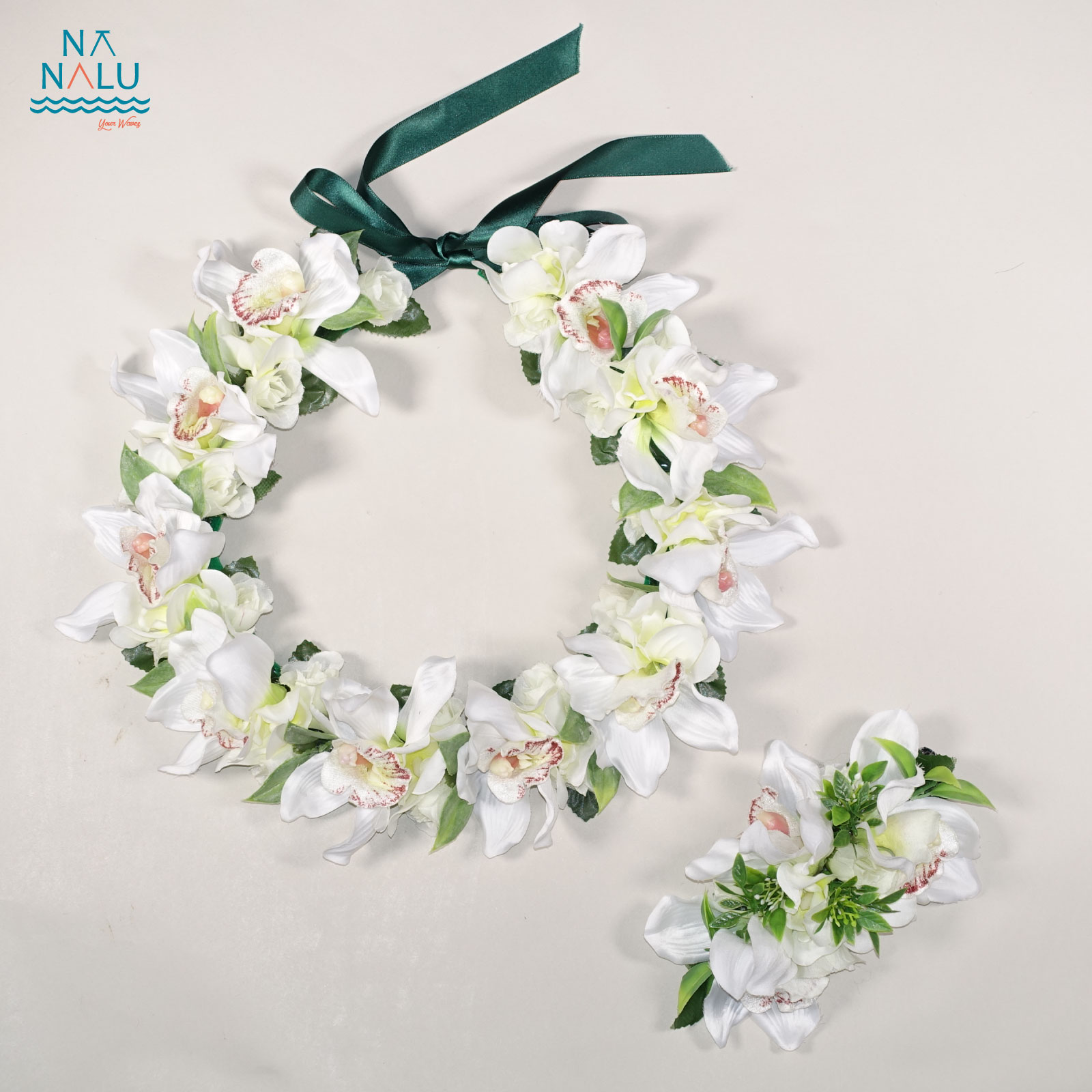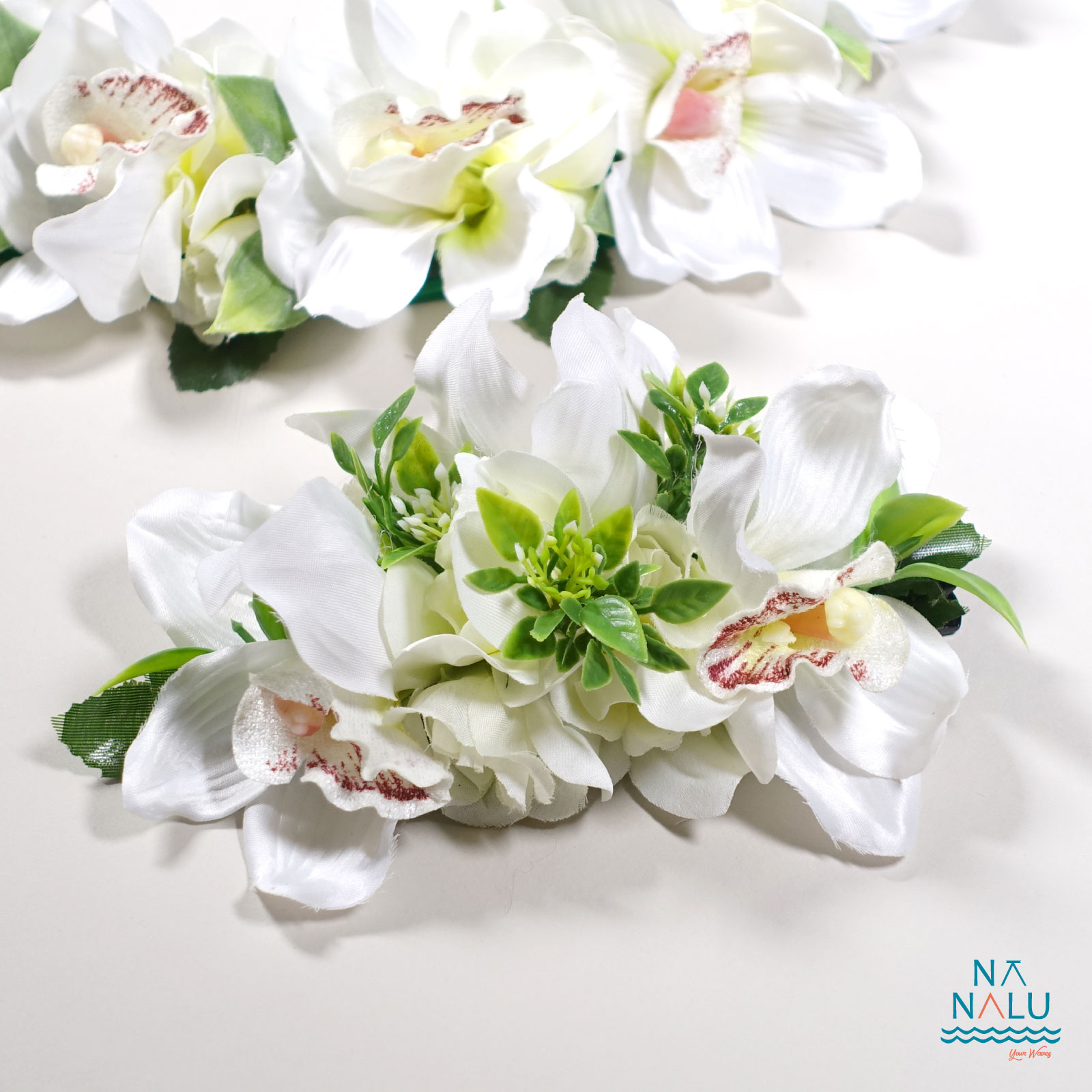 白いシンビジュームと小さめのローズを使ったほぼシンビジュームの豪華でシンプルなレイ&クリップです。