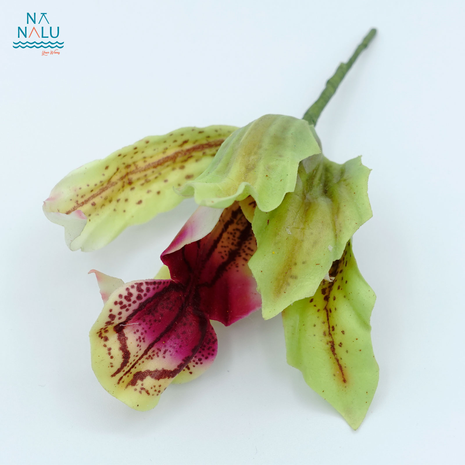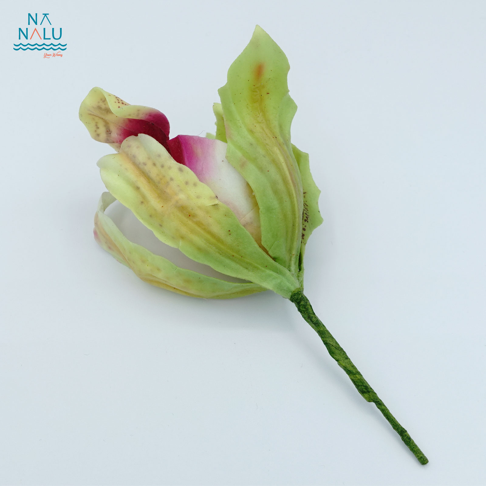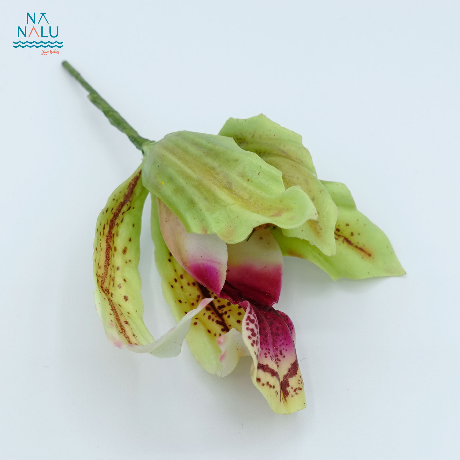 リアルシンビジューム ピック P02039-G リアルシンビジューム ピック お手持ちのヘアクリップ(髪飾り)に追加して刺してお使いいただける花材です。 花を追加して、ヘアクリップを華やかに演出できます。 この花は、シンビジューム(欄)の半開きの状態です。大きく開いた花にデコレーションするのに便利です。 素材は、ビニール樹脂のリアルな作りです。 サイズは、長さ16cm、幅9cm、茎の長さ6cm ※花材は変更になる場合がございます。 ※オリジナルクリップのオーダーを承っております。お気軽にご相談ください。 在庫有り ¥880 ¥880(税込) 数量