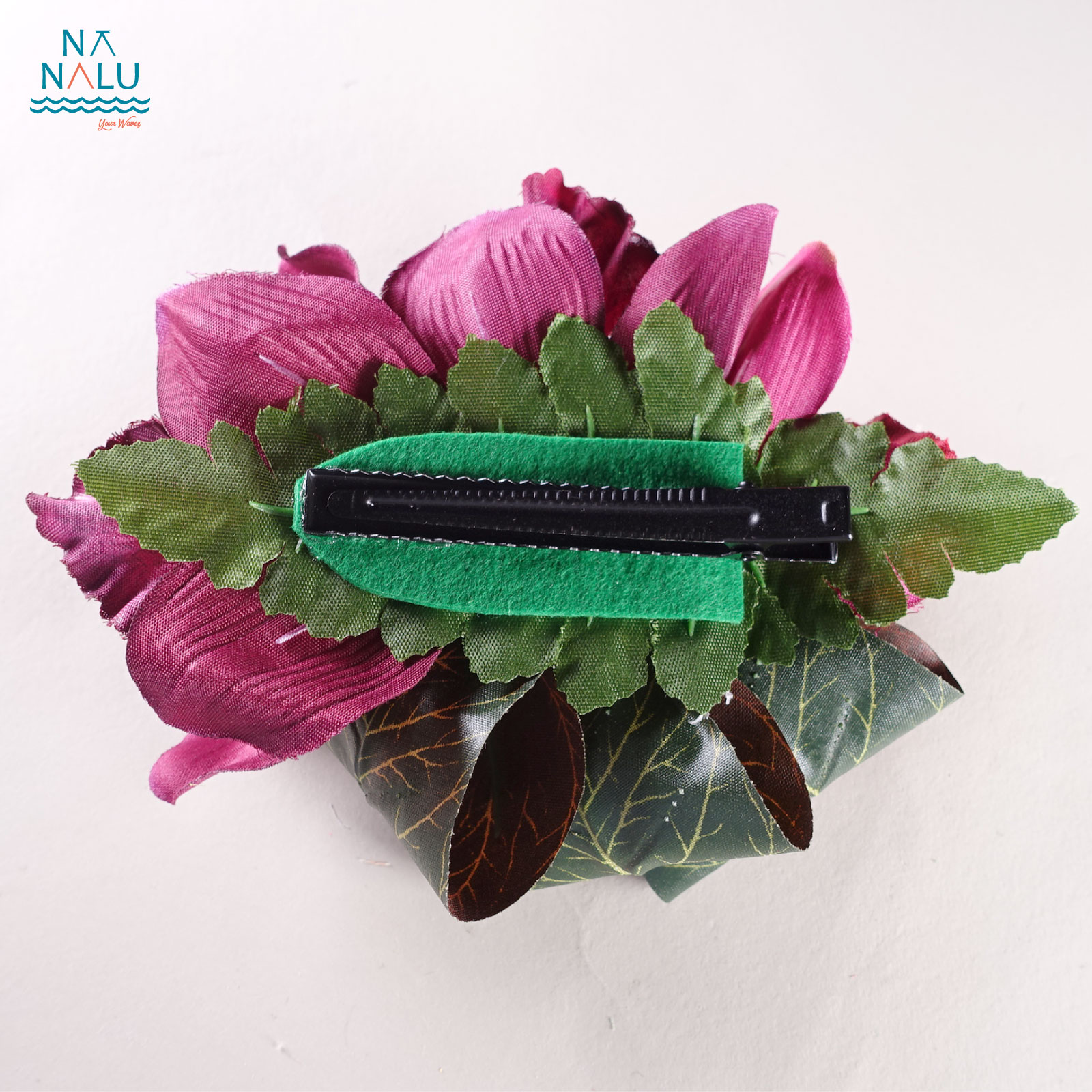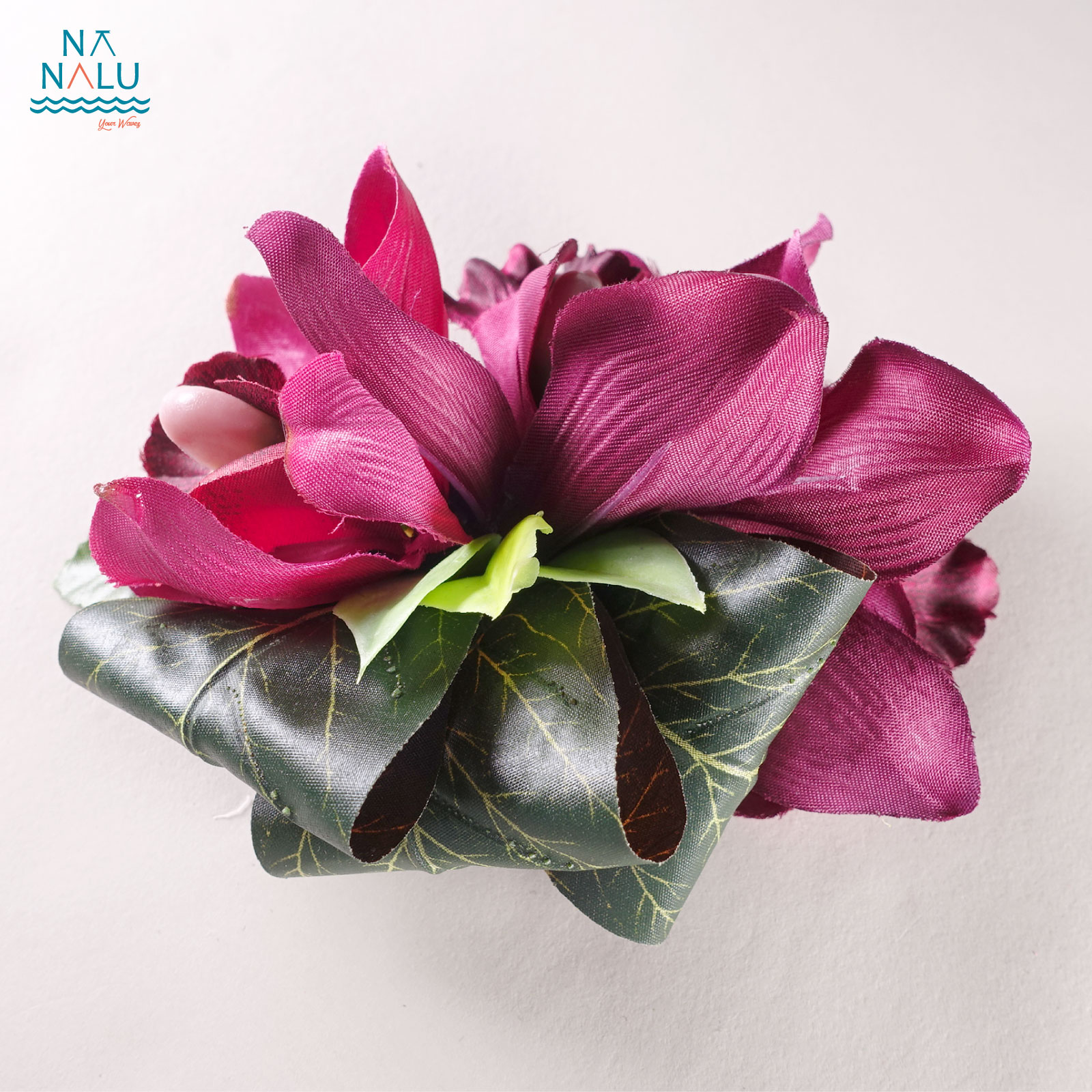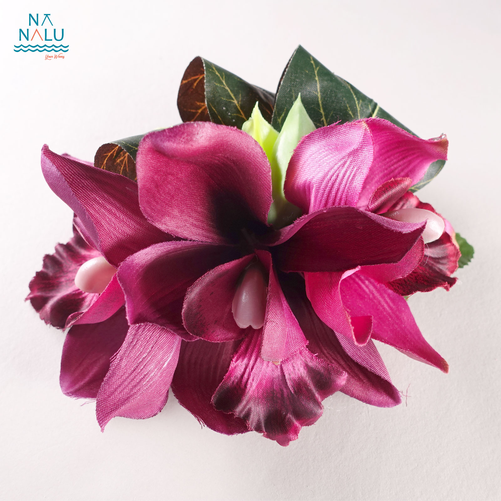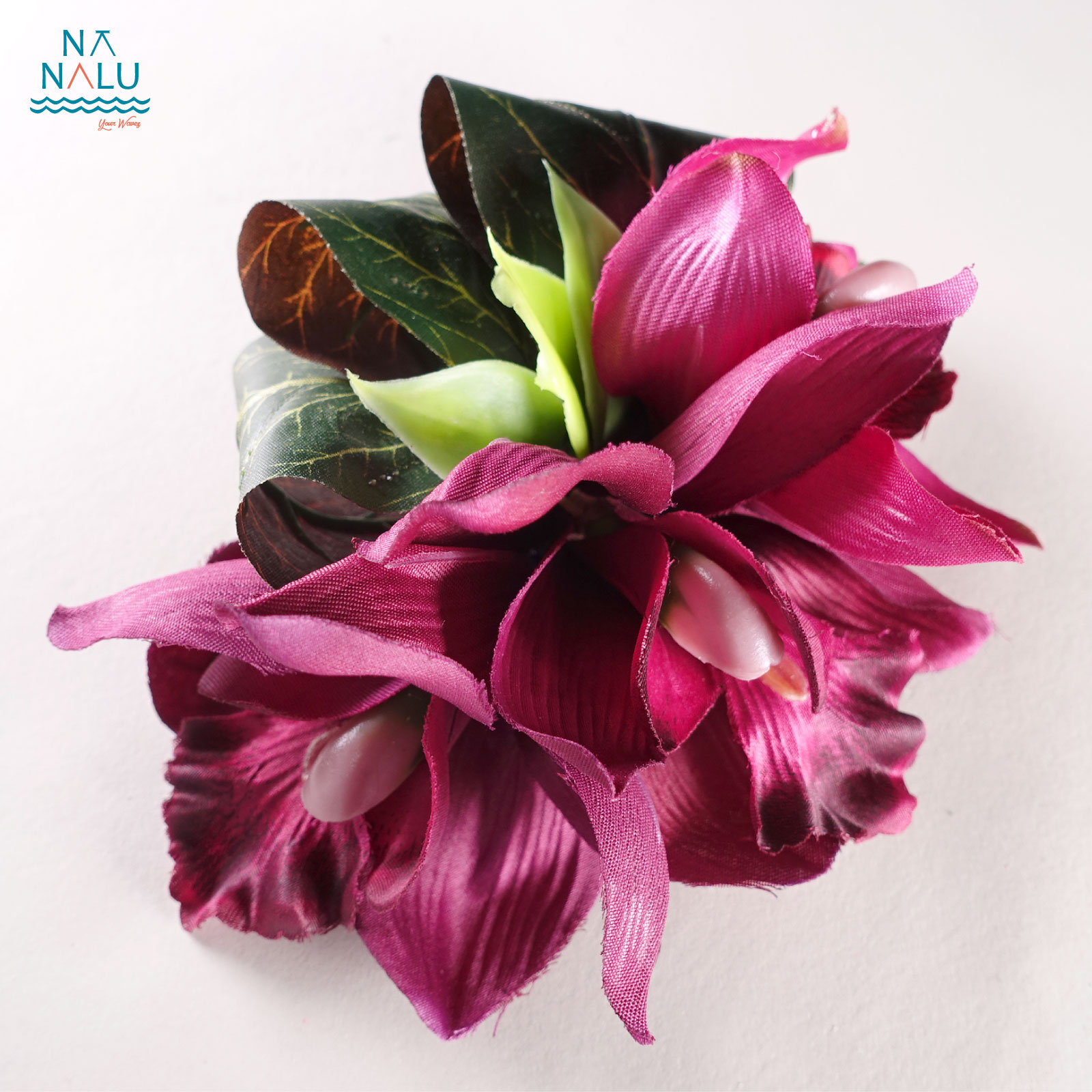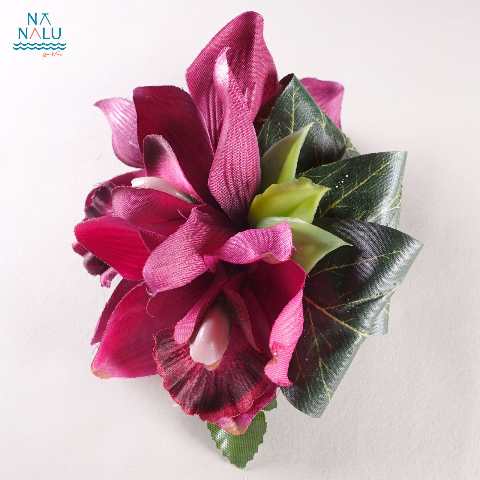 シンビジューム(蘭)クリップです。ティリーフをリボンのように追加した華やかですがシンプルなヘアクリップ(髪飾り)です。
