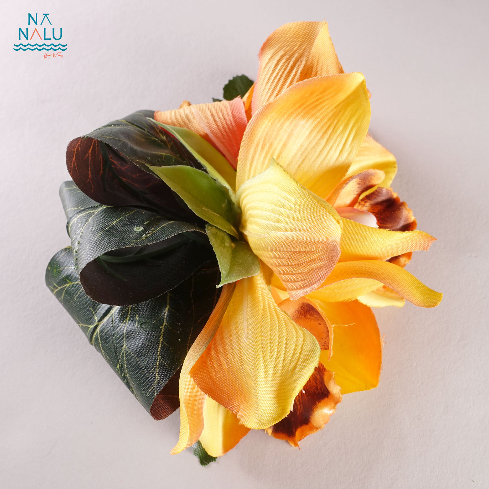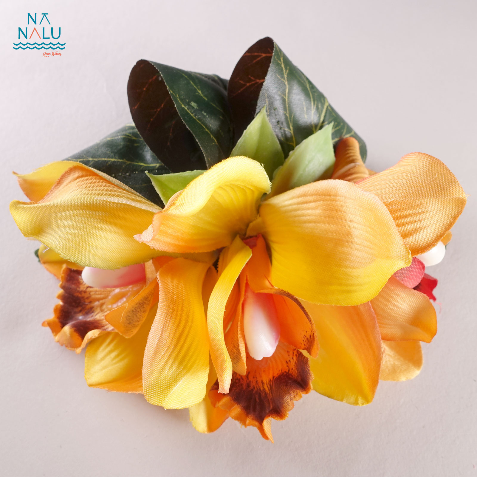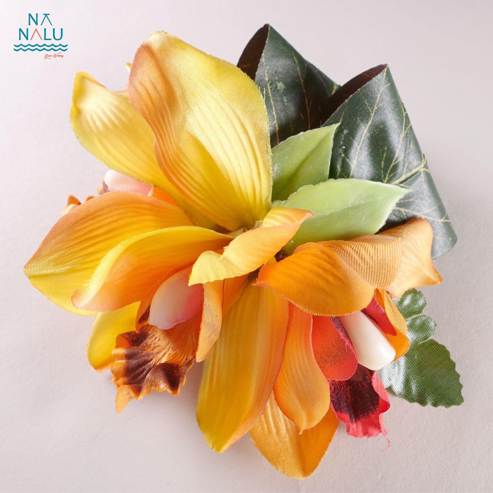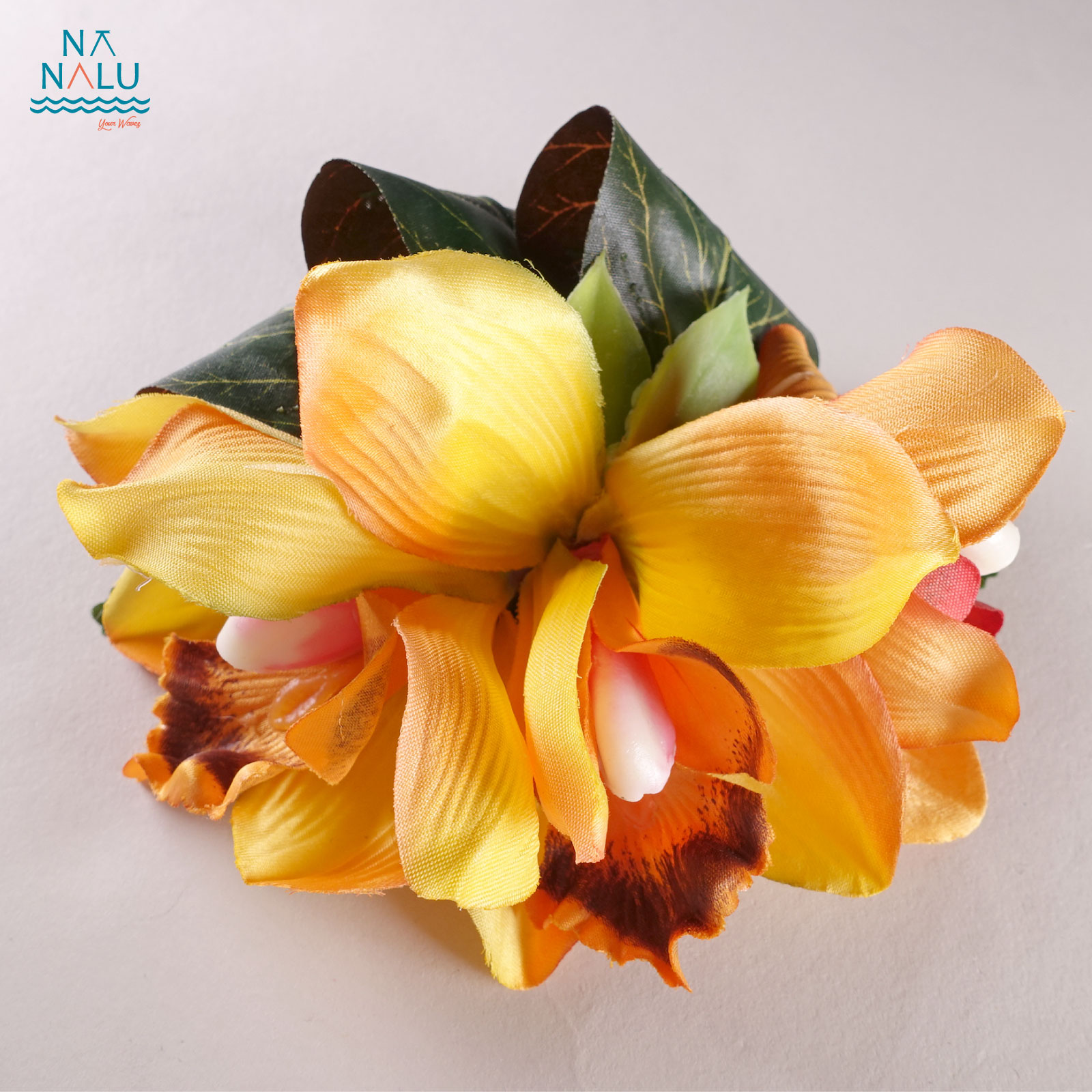 シンビジューム(蘭)クリップです。ティリーフをリボンのように追加した華やかですがシンプルなヘアクリップ(髪飾り)です。