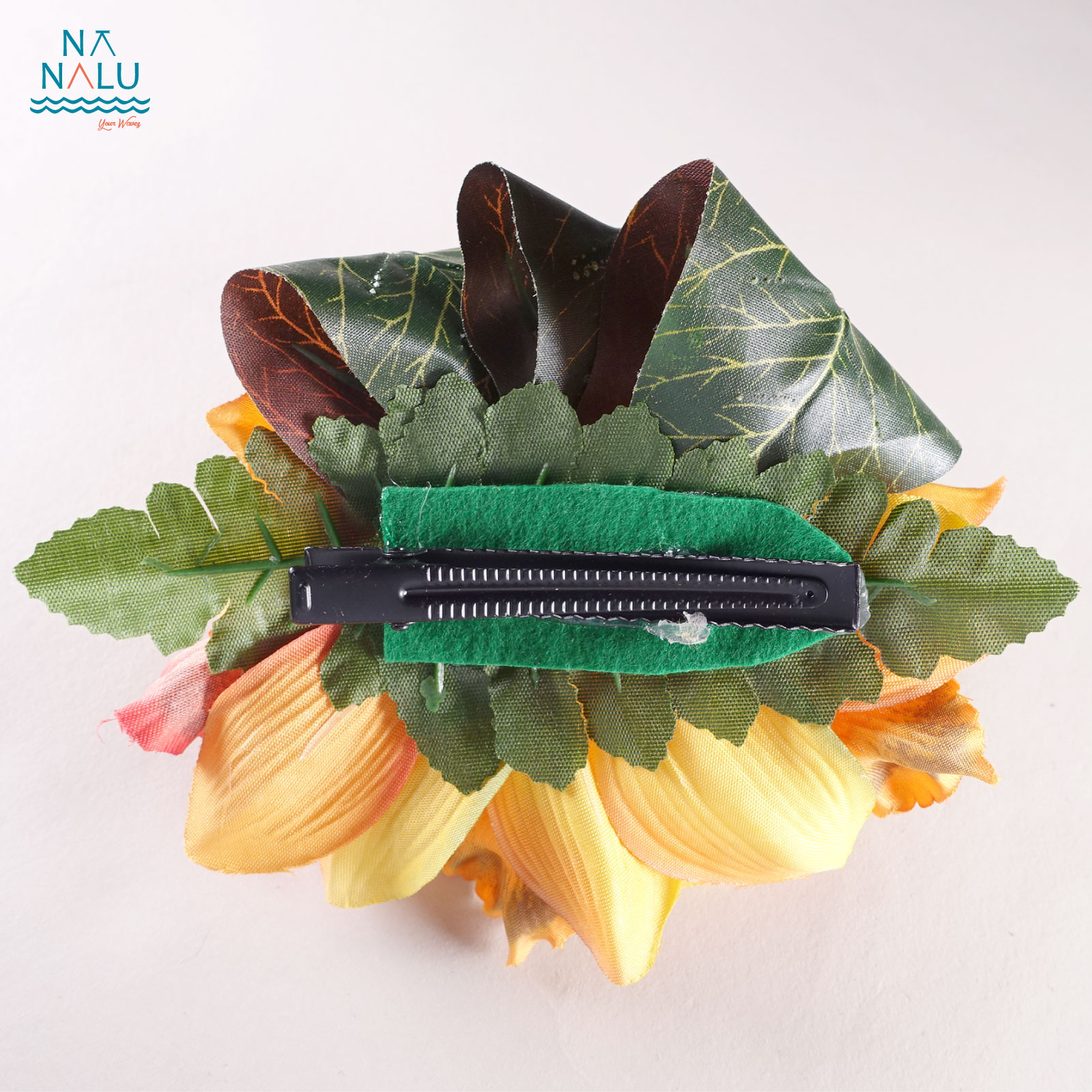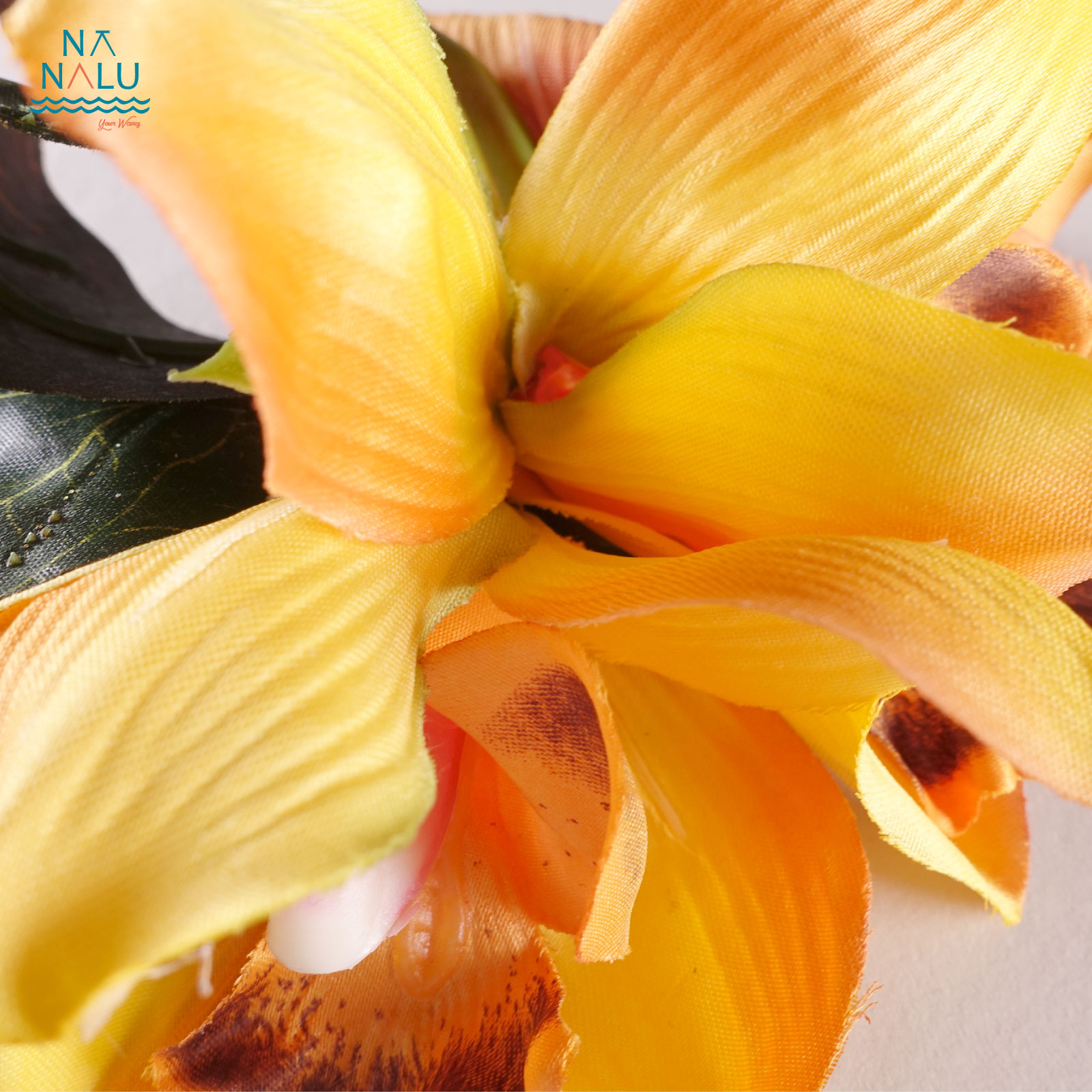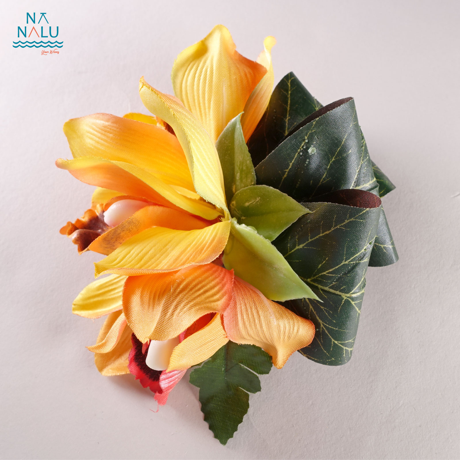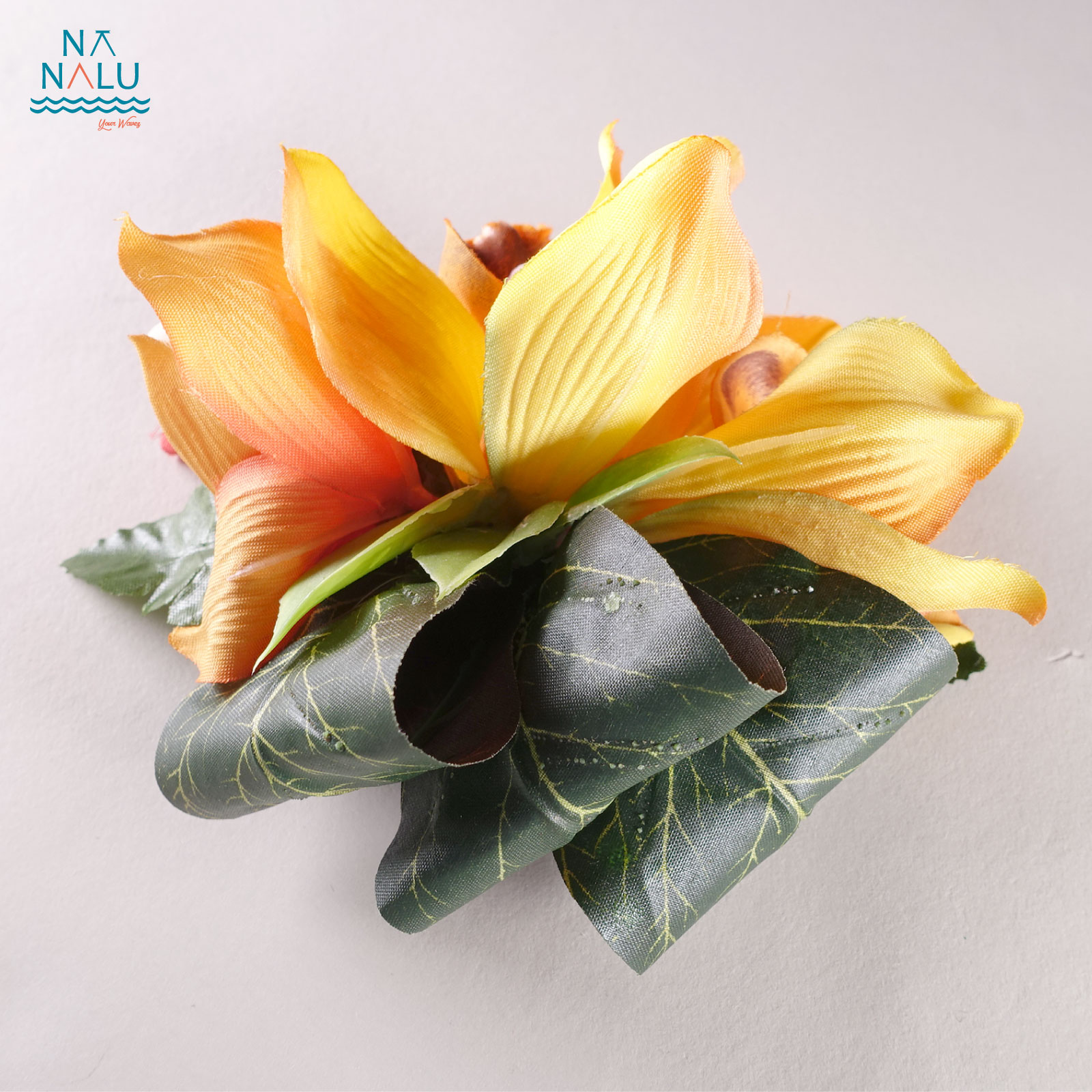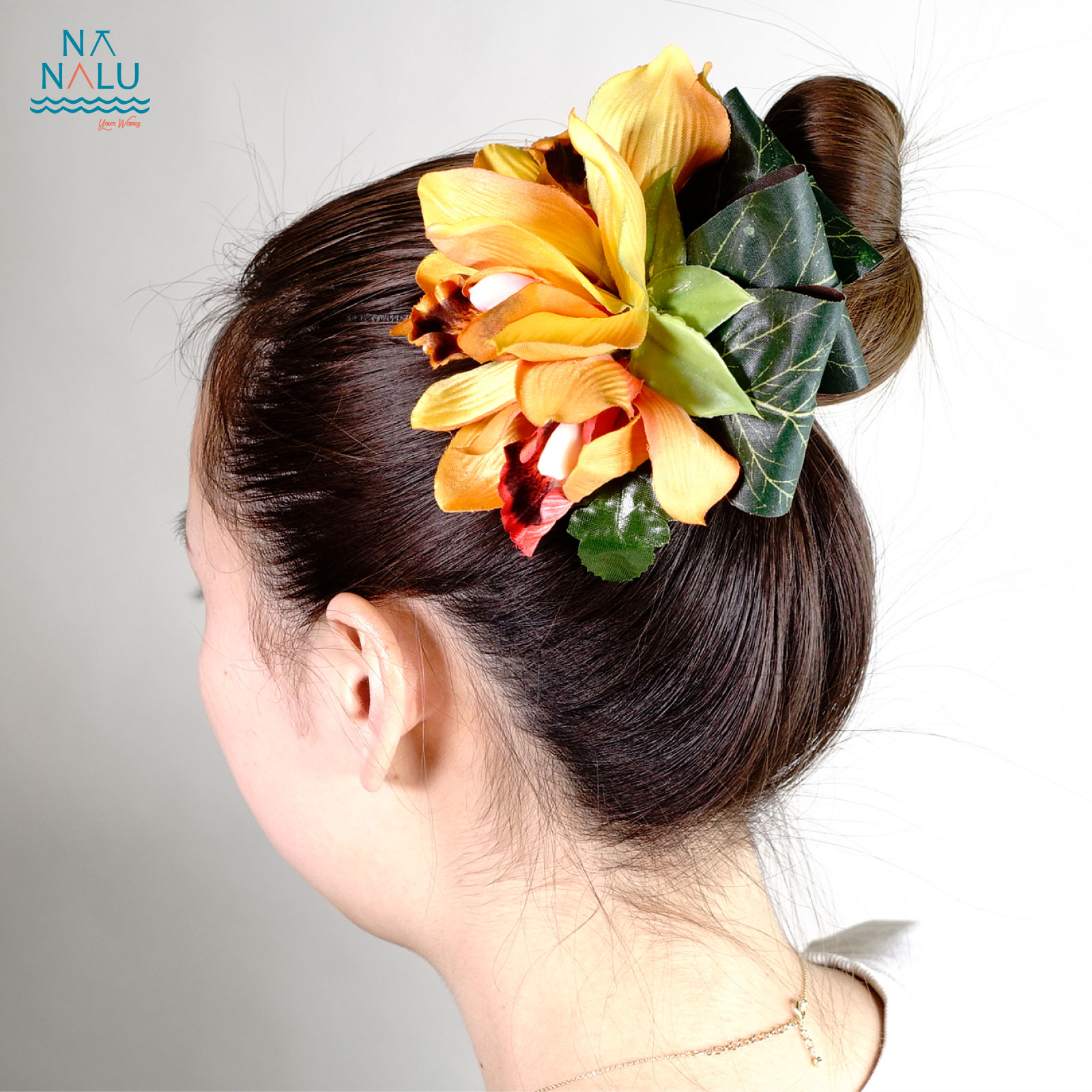 シンビジューム(蘭)クリップです。ティリーフをリボンのように追加した華やかですがシンプルなヘアクリップ(髪飾り)です。